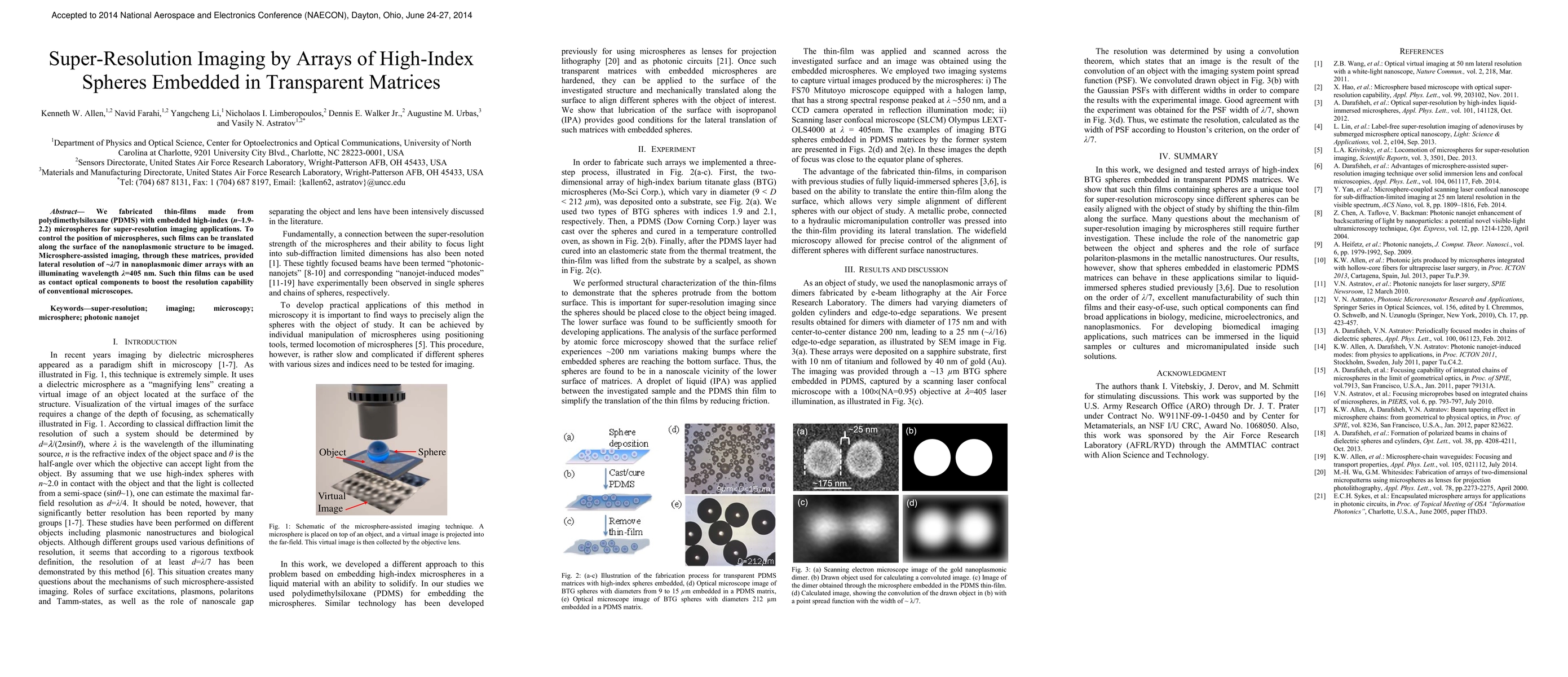 This paper describes the fabrication of thin PDMS films embedded with high-index microspheres for super-resolution imaging, achieving lateral resolution of ~λ/7 in nanoplasmonic dimer arrays. These films can enhance the resolution of conventional microscopes by translating along the surface of the nanoplasmonic structure.