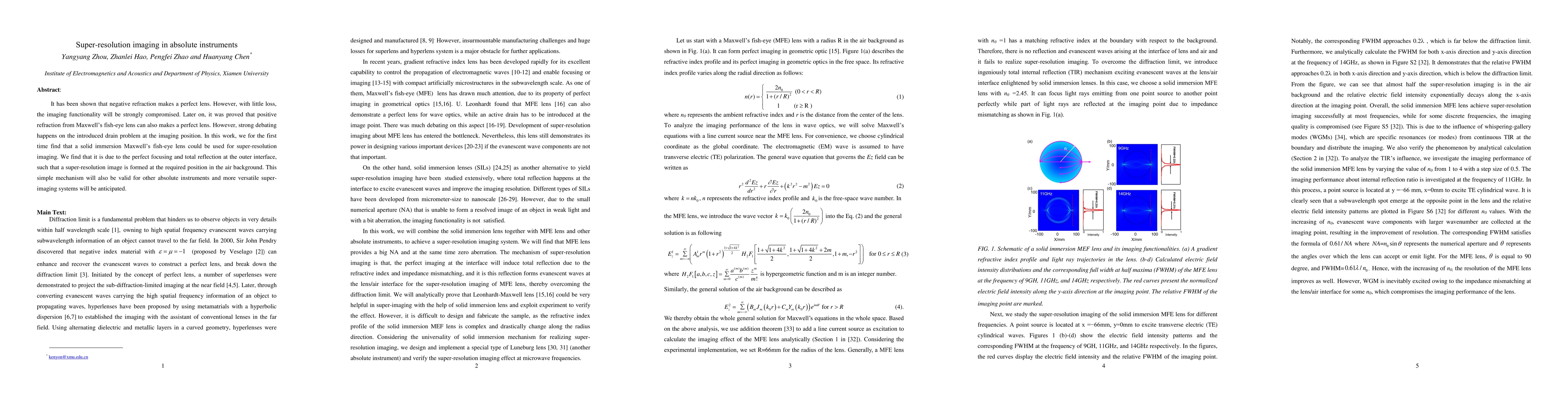 This paper demonstrates that a solid immersion Maxwell's fish-eye lens can achieve super-resolution imaging through perfect focusing and total reflection, overcoming previous issues with conventional lenses. This mechanism holds promise for enhancing imaging in other absolute instruments and versatile super-imaging systems.