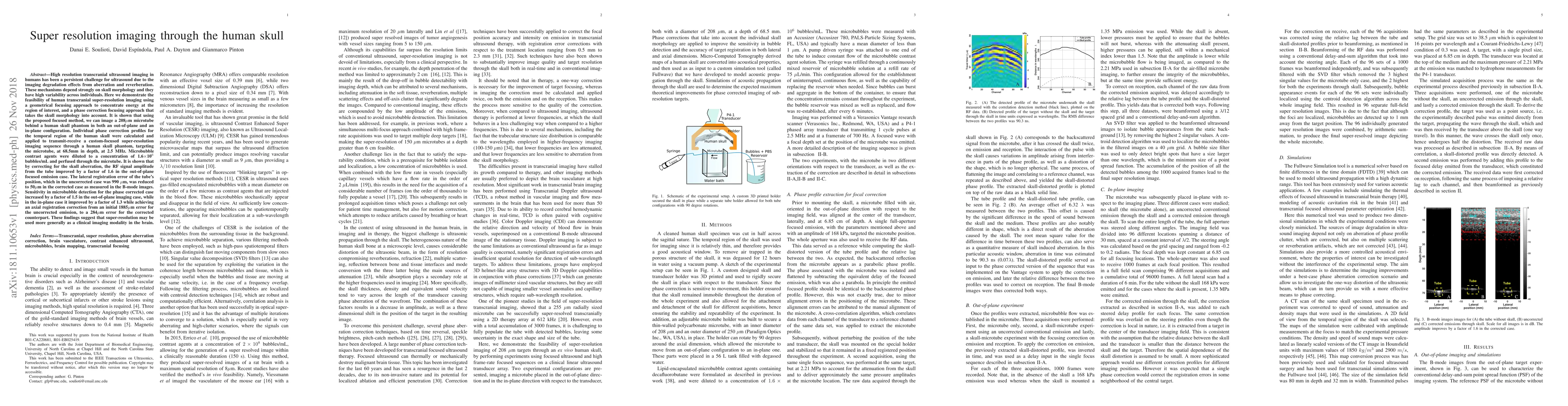 High resolution transcranial ultrasound imaging in humans has been a persistent challenge for ultrasound due to the imaging degradation effects from aberration and reverberation. These mechanisms depend strongly on skull morphology and they have high variability across individuals. Here we demonstrate the feasibility of human transcranial super-resolution imaging using a geometrical focusing approach to concentrate energy at the region of interest, and a phase correction focusing approach that takes the skull morphology into account. It is shown that using the proposed focused method, we can image a 208$\mu$m microtube behind a human skull phantom in both an out-of-plane and an in-plane configuration. Individual phase correction profiles for the temporal region of the human skull were calculated and applied to transmit-receive a custom-focused super-resolution imaging sequence through a human skull phantom, targeting the microtube, at 68.5mm in depth, at 2.5 MHz. Microbubble contrast agents were diluted to a concentration of 1.6$\times$10$^6$ bubbles/mL and perfused through the microtube. It is shown that by correcting for the skull aberration, the RF signal amplitude from the tube improved by a factor of 1.6 in the out-of-plane focused emission case. The lateral registration error of the tube's position, which in the uncorrected case was 990 $\mu$m, was reduced to 50$\mu$m in the corrected case as measured in the B-mode images. Sensitivity in microbubble detection for the phase corrected case increased by a factor of 1.5 in the out-of-plane imaging case, while in the in-plane case it improved by a factor of 1.3 while achieving an axial registration correction from an initial 1885$\mu$m error for the uncorrected emission, to a 284$\mu$m error for the corrected counterpart. These findings suggest that super-resolution may be used more generally as a clinical imaging modality in the brain.