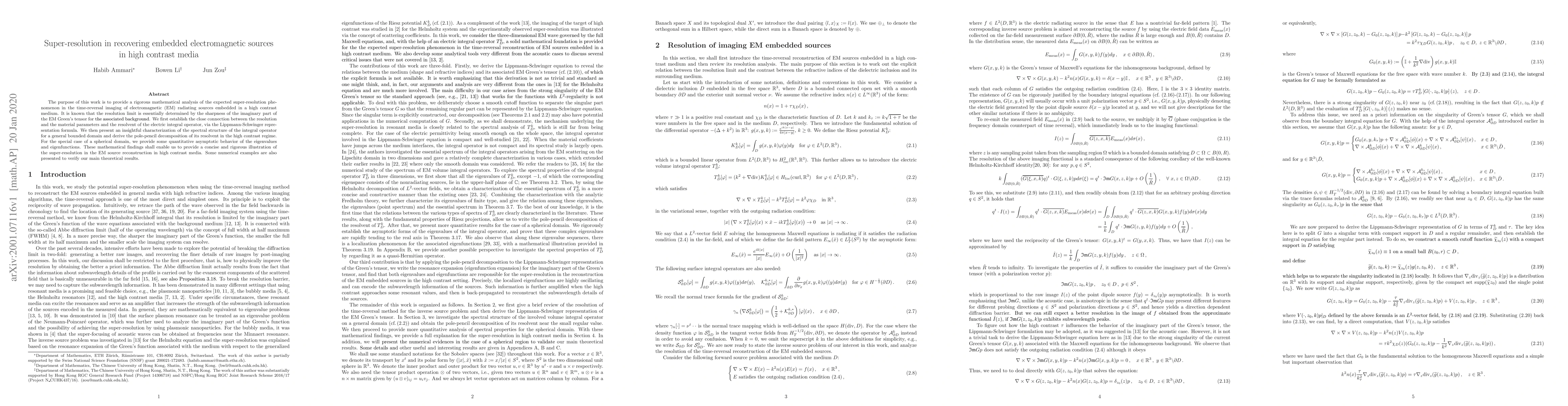 The purpose of this work is to provide a rigorous mathematical analysis of the expected super-resolution phenomenon in the time-reversal imaging of electromagnetic (EM) radiating sources embedded in a high contrast medium. It is known that the resolution limit is essentially determined by the sharpness of the imaginary part of the EM Green's tensor for the associated background. We first establish the close connection between the resolution and the material parameters and the resolvent of the electric integral operator, via the Lippmann-Schwinger representation formula. We then present an insightful characterization of the spectral structure of the integral operator for a general bounded domain and derive the pole-pencil decomposition of its resolvent in the high contrast regime. For the special case of a spherical domain, we provide some quantitative asymptotic behavior of the eigenvalues and eigenfunctions. These mathematical findings shall enable us to provide a concise and rigorous illustration of the super-resolution in the EM source reconstruction in high contrast media. Some numerical examples are also presented to verify our main theoretical results.