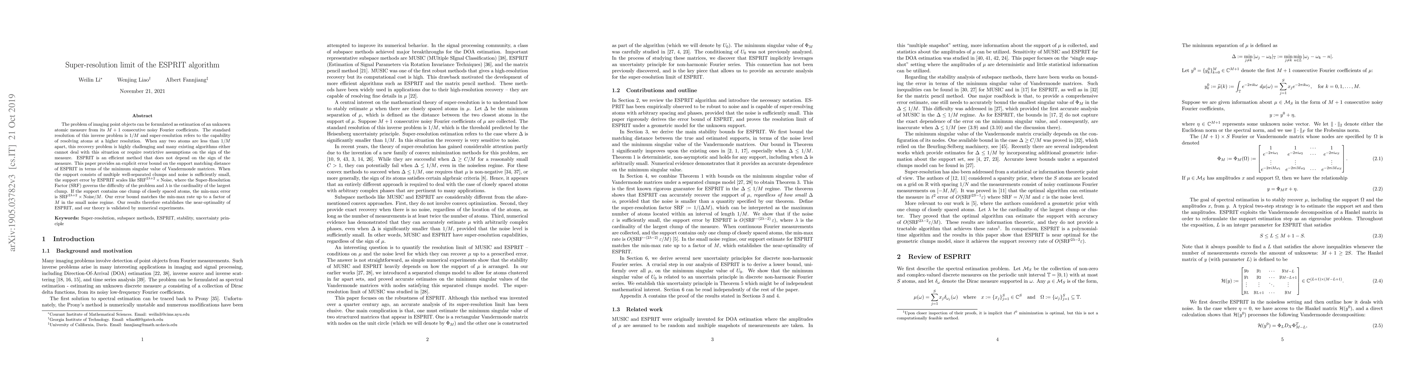 A new error bound for the ESPRIT algorithm is established, showing near-optimality in resolving point objects beyond its standard resolution limit of $1/M$, with errors scaling like ${ m SRF}^{2 heta + 2} imes { m Noise}$ when noise is small.