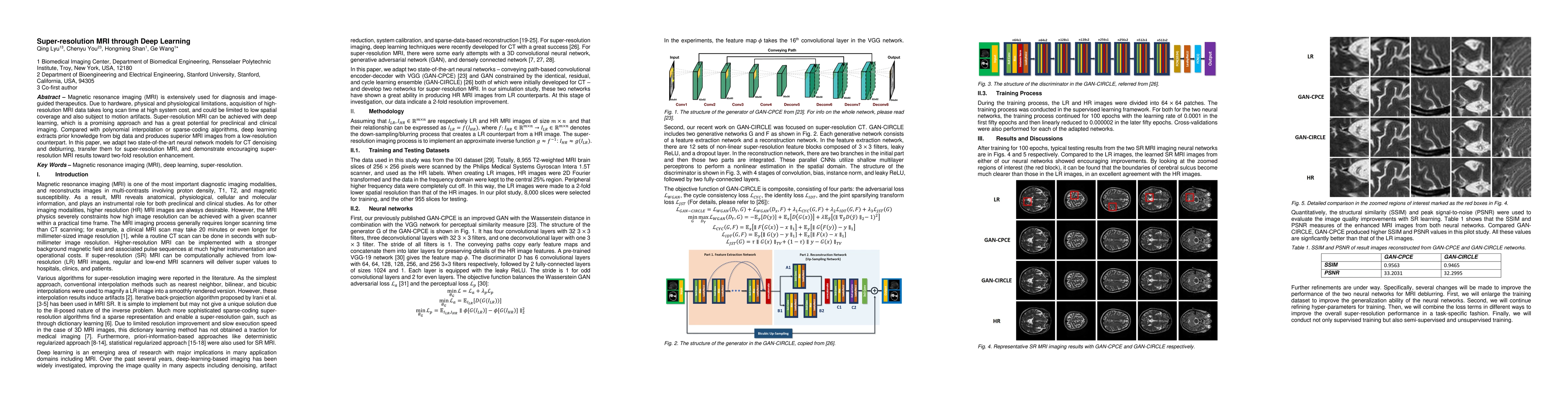 This paper explores the use of deep learning to achieve super-resolution MRI, enhancing image resolution from low-resolution inputs. It adapts neural network models originally designed for CT denoising and deblurring, demonstrating promising results in doubling MRI resolution while mitigating motion artifacts and reducing scan time.