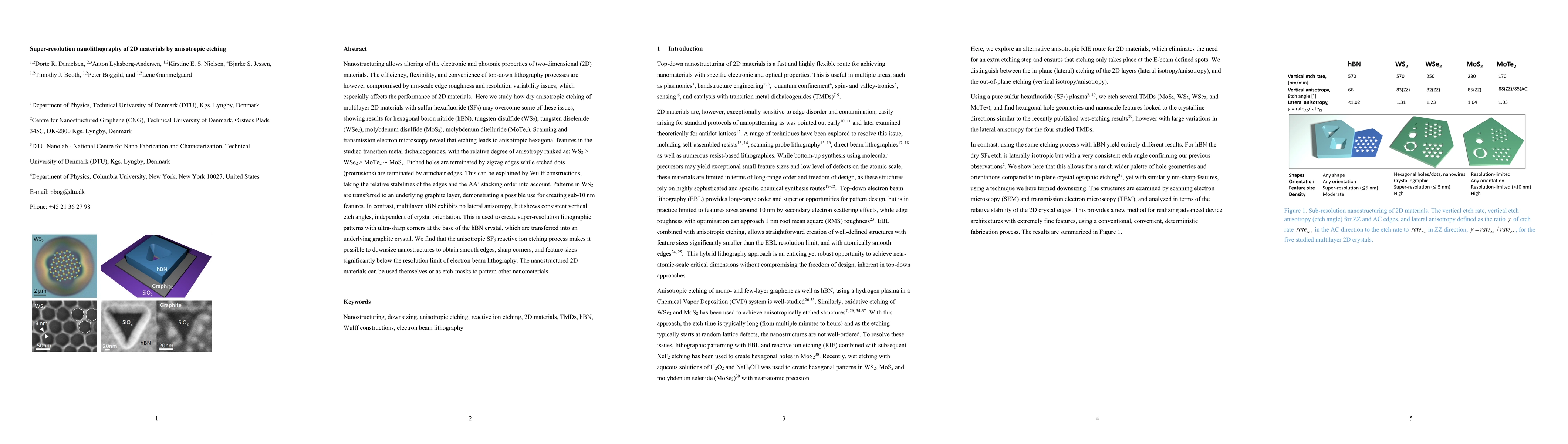 Nanostructuring allows altering of the electronic and photonic properties of two-dimensional (2D) materials. The efficiency, flexibility, and convenience of top-down lithography processes are however compromised by nm-scale edge roughness and resolution variability issues, which especially affects the performance of 2D materials. Here we study how dry anisotropic etching of multilayer 2D materials with sulfur hexafluoride (SF6) may overcome some of these issues, showing results for hexagonal boron nitride (hBN), tungsten disulfide (WS2), tungsten diselenide (WSe2), molybdenum disulfide (MoS2), molybdenum ditelluride (MoTe2). Scanning and transmission electron microscopy reveal that etching leads to anisotropic hexagonal features in the studied transition metal dichalcogenides, with the relative degree of anisotropy ranked as: WS2 > WSe2 > MoTe2 / MoS2. Etched holes are terminated by zigzag edges while etched dots (protrusions) are terminated by armchair edges. This can be explained by Wulff constructions, taking the relative stabilities of the edges and the AA stacking order into account. Patterns in WS2 are transferred to an underlying graphite layer, demonstrating a possible use for creating sub-10 nm features. In contrast, multilayer hBN exhibits no lateral anisotropy, but shows consistent vertical etch angles, independent of crystal orientation. This is used to create super-resolution lithographic patterns with ultra-sharp corners at the base of the hBN crystal, which are transferred into an underlying graphite crystal. We find that the anisotropic SF6 reactive ion etching process makes it possible to downsize nanostructures to obtain smooth edges, sharp corners, and feature sizes significantly below the resolution limit of electron beam lithography. The nanostructured 2D materials can be used themselves or as etch-masks to pattern other nanomaterials.
