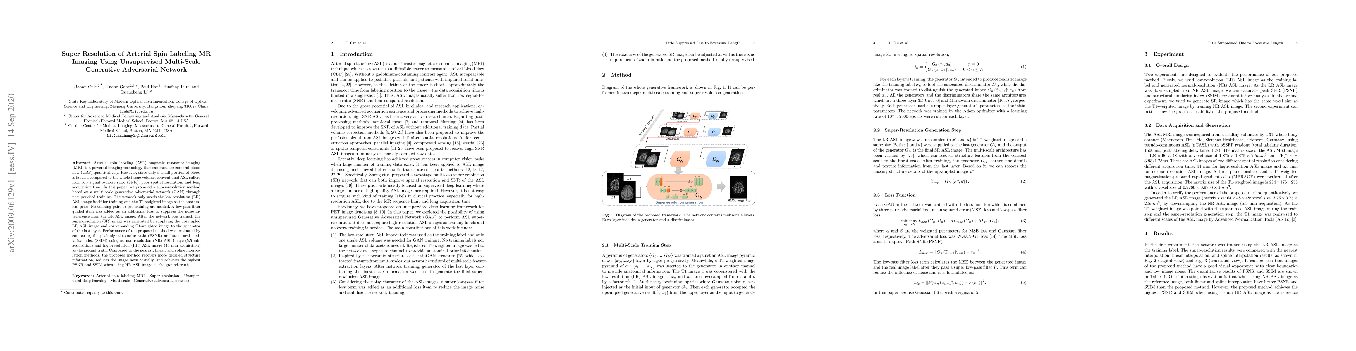 This paper proposes an unsupervised multi-scale generative adversarial network (GAN) for super-resolving low-resolution arterial spin labeling (ASL) MRI images, using only the low-resolution ASL image and T1-weighted image as training inputs. The method achieves higher peak signal-to-noise ratio (PSNR) and structural similarity index (SSIM) compared to conventional interpolation methods, yielding more detailed and less noisy high-resolution images.