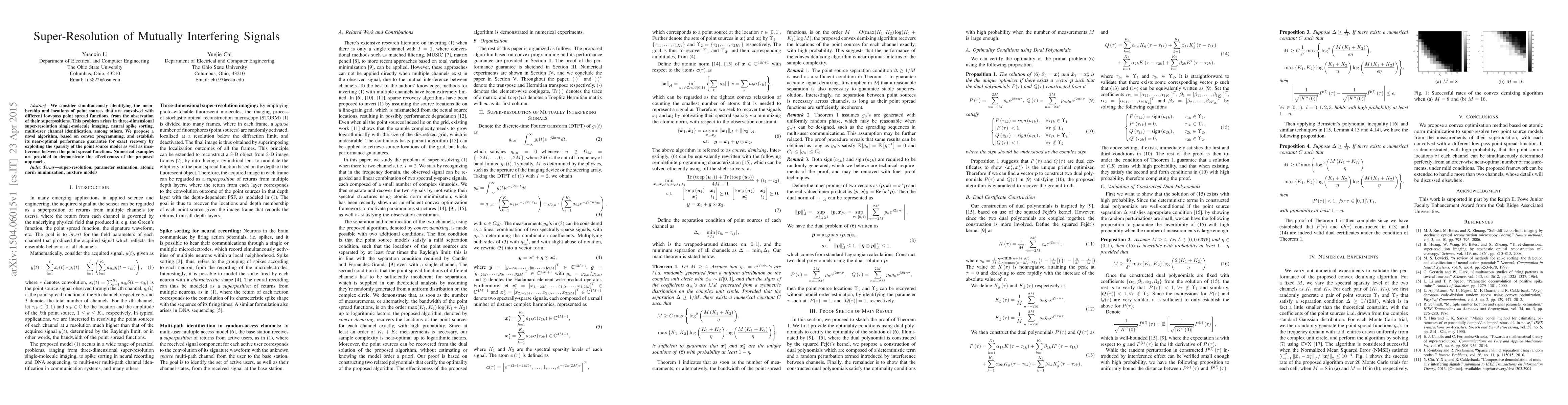 Researchers propose an algorithm for simultaneous identification of point sources with different signals using convex programming, achieving near-optimal performance through the sparsity of point source models and incoherence between signal functions.