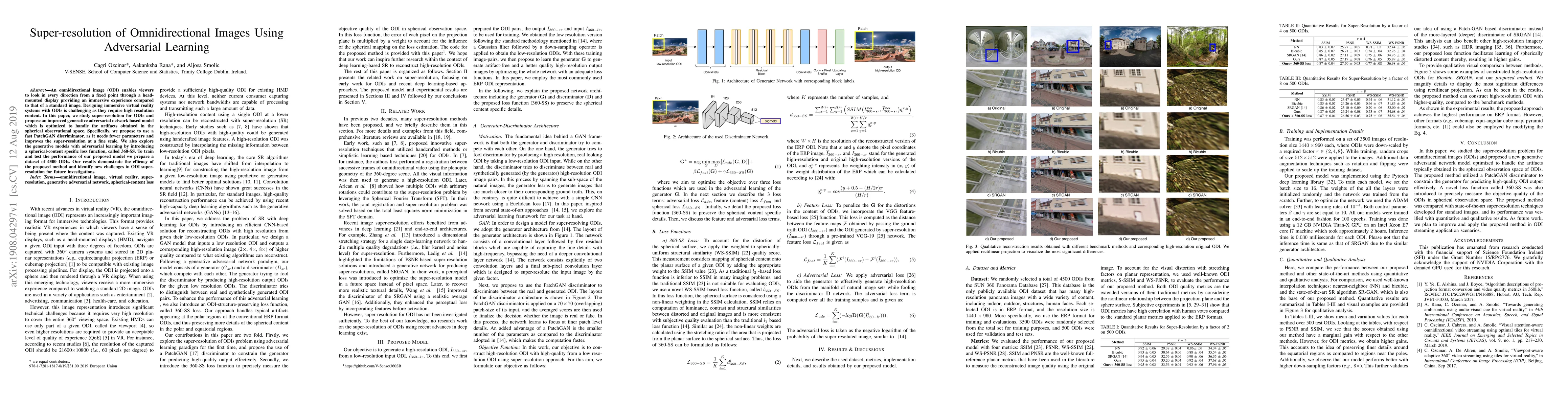This paper proposes an improved generative adversarial network for super-resolving omnidirectional images, utilizing a fast PatchGAN discriminator and a spherical-content specific loss function (360-SS) to address unique artifacts in the spherical observational space. The model is tested on a dataset of 4500 ODIs, demonstrating its effectiveness in enhancing resolution.