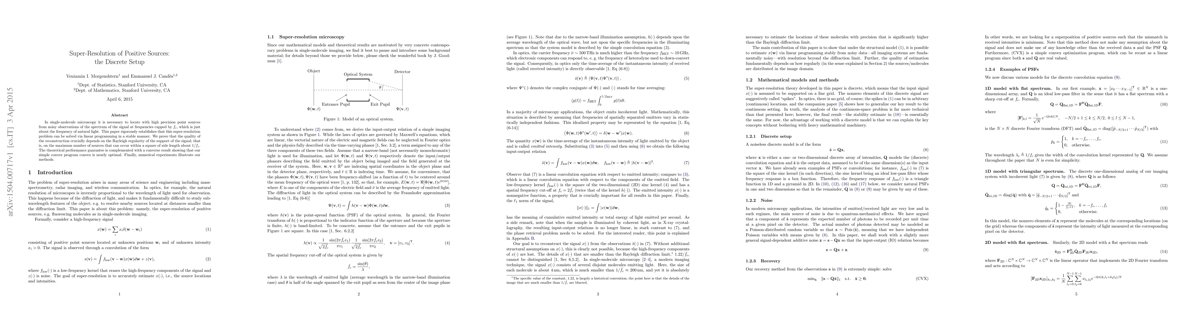 In single-molecule microscopy it is necessary to locate with high precision point sources from noisy observations of the spectrum of the signal at frequencies capped by $f_c$, which is just about the frequency of natural light. This paper rigorously establishes that this super-resolution problem can be solved via linear programming in a stable manner. We prove that the quality of the reconstruction crucially depends on the Rayleigh regularity of the support of the signal; that is, on the maximum number of sources that can occur within a square of side length about $1/f_c$. The theoretical performance guarantee is complemented with a converse result showing that our simple convex program convex is nearly optimal. Finally, numerical experiments illustrate our methods.