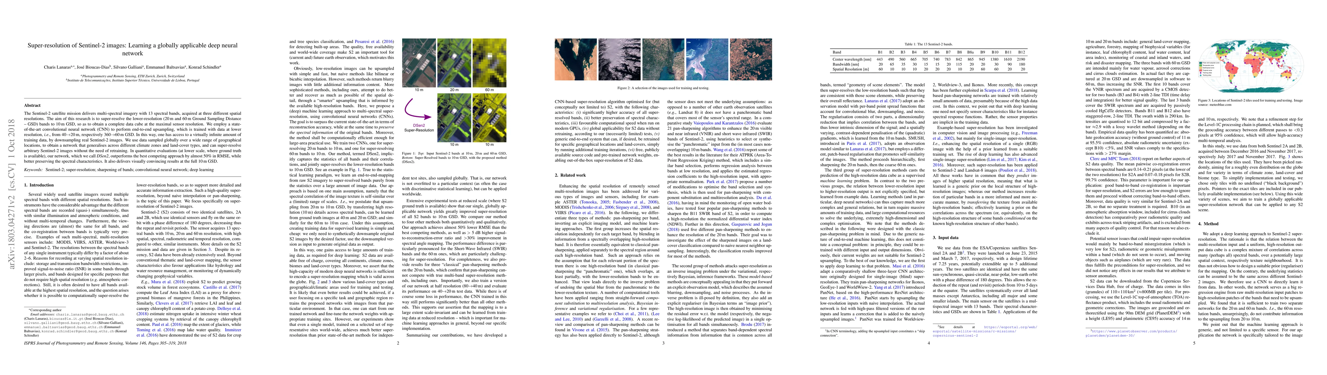 This paper proposes a convolutional neural network (CNN) named DSen2 to super-resolve lower-resolution Sentinel-2 satellite images to 10 m GSD, trained globally to generalize across diverse climates and land covers. The DSen2 network outperforms existing methods by nearly 50% in RMSE while maintaining spectral integrity.