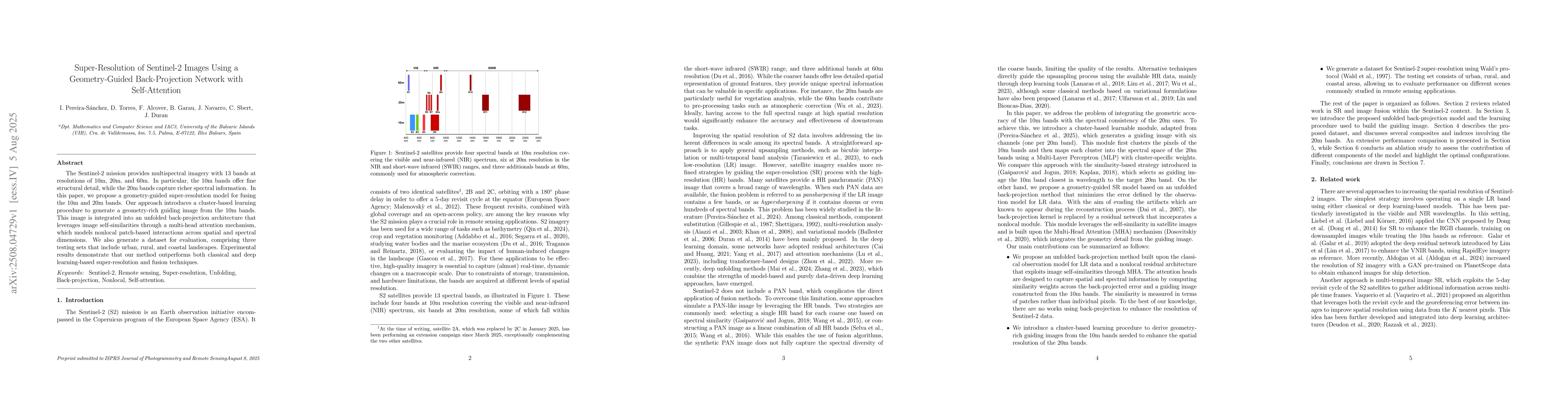 The Sentinel-2 mission provides multispectral imagery with 13 bands at resolutions of 10m, 20m, and 60m. In particular, the 10m bands offer fine structural detail, while the 20m bands capture richer spectral information. In this paper, we propose a geometry-guided super-resolution model for fusing the 10m and 20m bands. Our approach introduces a cluster-based learning procedure to generate a geometry-rich guiding image from the 10m bands. This image is integrated into an unfolded back-projection architecture that leverages image self-similarities through a multi-head attention mechanism, which models nonlocal patch-based interactions across spatial and spectral dimensions. We also generate a dataset for evaluation, comprising three testing sets that include urban, rural, and coastal landscapes. Experimental results demonstrate that our method outperforms both classical and deep learning-based super-resolution and fusion techniques.