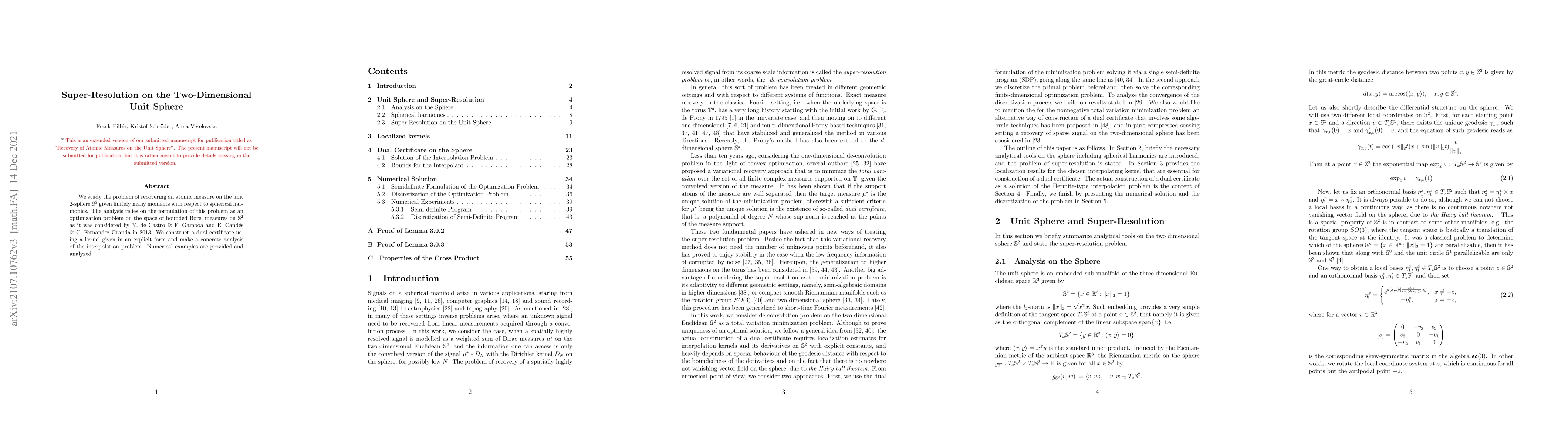 We study the problem of recovering an atomic measure on the unit 2-sphere $\mathbb{S}^2$ given finitely many moments with respect to spherical harmonics. The analysis relies on the formulation of this problem as an optimization problem on the space of bounded Borel measures on $\mathbb{S}^2$ as it was considered by Y. de Castro & F. Gamboa and E. Cand\'es & C. Fernandez-Granda. We construct a dual certificate using a kernel given in an explicit form and make a concrete analysis of the interpolation problem. Numerical examples are provided and analyzed.