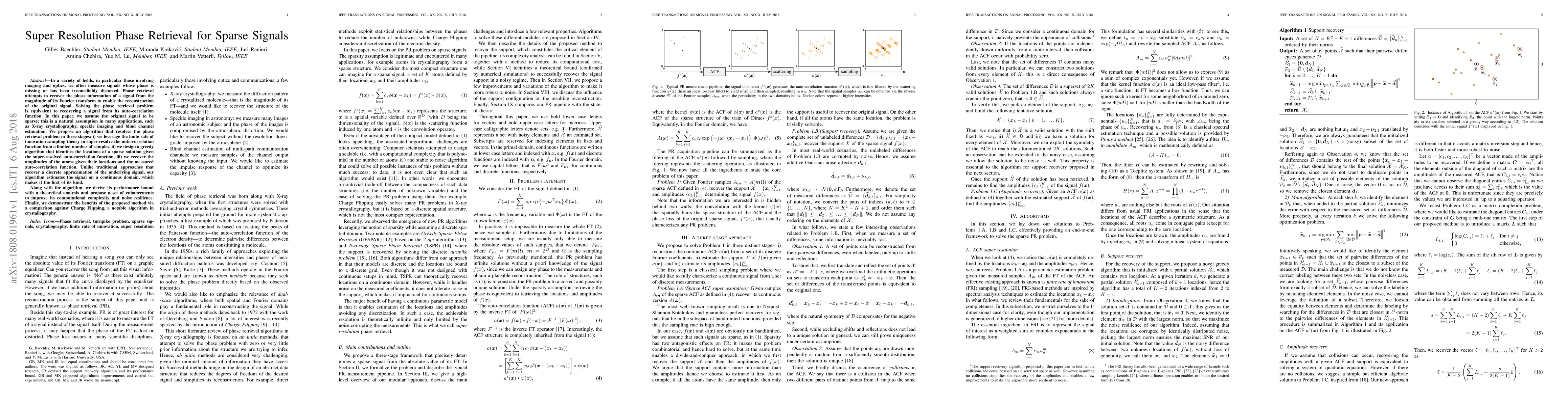 In a variety of fields, in particular those involving imaging and optics, we often measure signals whose phase is missing or has been irremediably distorted. Phase retrieval attempts to recover the phase information of a signal from the magnitude of its Fourier transform to enable the reconstruction of the original signal. Solving the phase retrieval problem is equivalent to recovering a signal from its auto-correlation function. In this paper, we assume the original signal to be sparse; this is a natural assumption in many applications, such as X-ray crystallography, speckle imaging and blind channel estimation. We propose an algorithm that resolves the phase retrieval problem in three stages: i) we leverage the finite rate of innovation sampling theory to super-resolve the auto-correlation function from a limited number of samples, ii) we design a greedy algorithm that identifies the locations of a sparse solution given the super-resolved auto-correlation function, iii) we recover the amplitudes of the atoms given their locations and the measured auto-correlation function. Unlike traditional approaches that recover a discrete approximation of the underlying signal, our algorithm estimates the signal on a continuous domain, which makes it the first of its kind. Along with the algorithm, we derive its performance bound with a theoretical analysis and propose a set of enhancements to improve its computational complexity and noise resilience. Finally, we demonstrate the benefits of the proposed method via a comparison against Charge Flipping, a notable algorithm in crystallography.