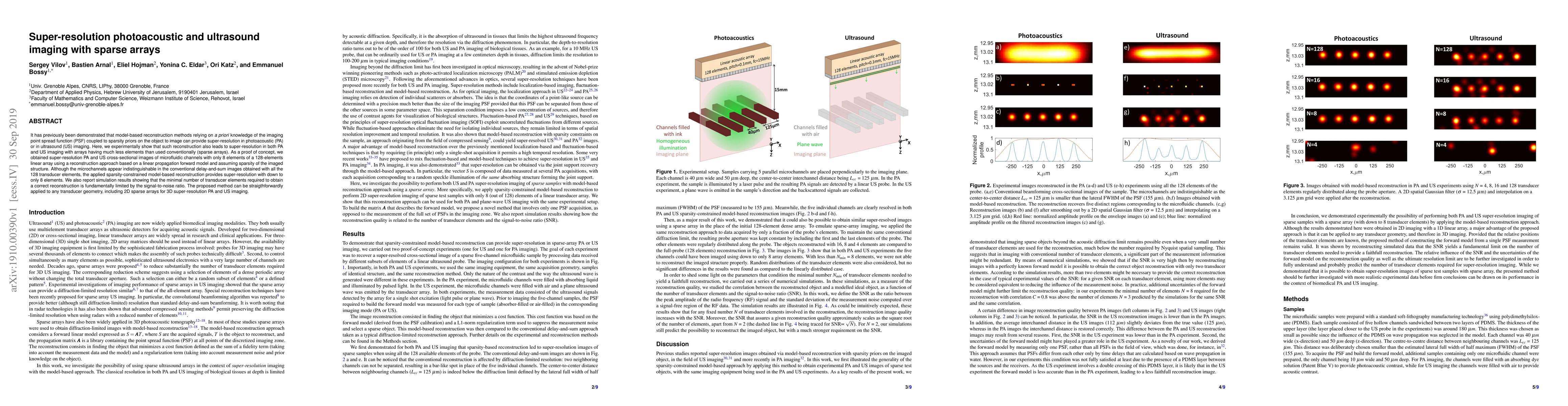 This paper demonstrates that sparse arrays can achieve super-resolution in photoacoustic and ultrasound imaging through model-based reconstruction leveraging sparsity priors. Experimental results show that only 8 elements of a 128-element linear array can provide super-resolution, highlighting the potential of this method for reducing the number of transducer elements while maintaining image quality.