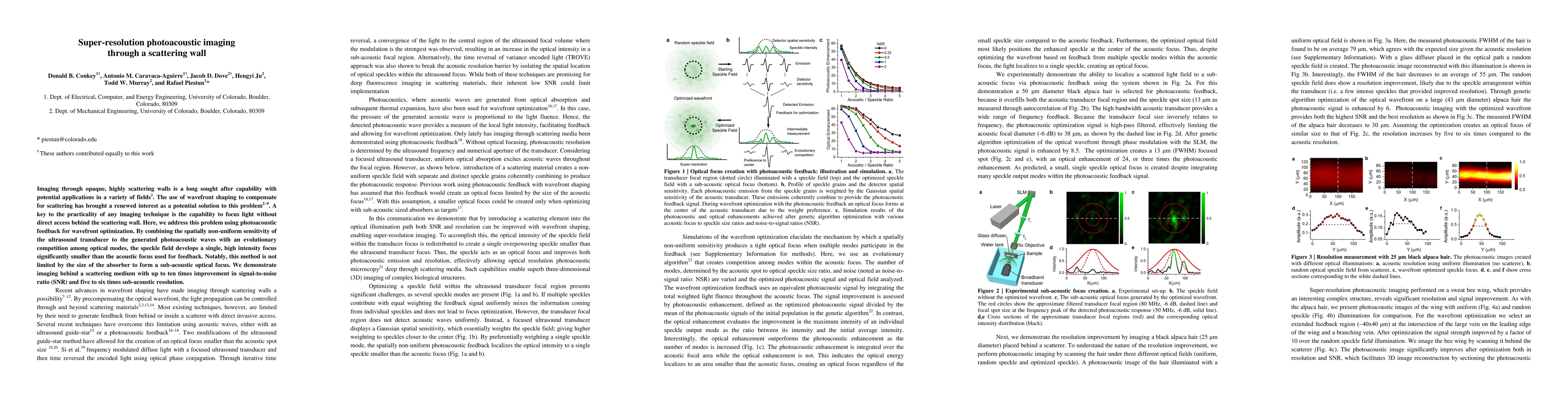 This paper presents a novel super-resolution photoacoustic imaging technique that enables high-fidelity imaging through scattering walls, achieving up to ten times better signal-to-noise ratio and five to six times higher resolution than traditional methods. The method leverages photoacoustic feedback and wavefront optimization to focus light behind the wall, offering potential applications in medical imaging and neuroscience.