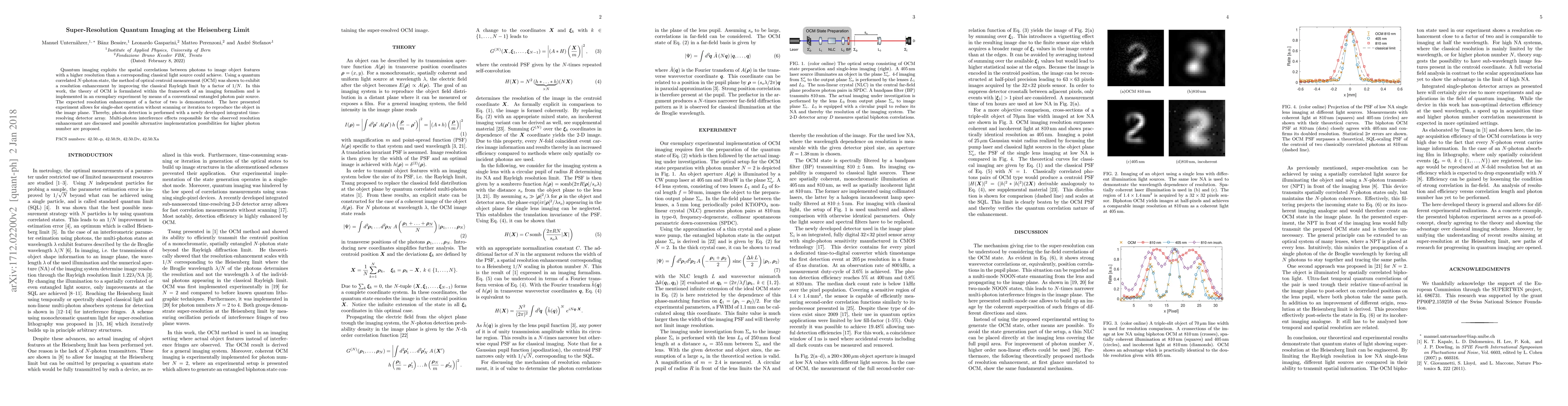Quantum imaging exploits the spatial correlations between photons to image object features with a higher resolution than a corresponding classical light source could achieve. Using a quantum correlated $N$-photon state, the method of optical centroid measurement (OCM) was shown to exhibit a resolution enhancement by improving the classical Rayleigh limit by a factor of $1/N$. In this work, the theory of OCM is formulated within the framework of an imaging formalism and is implemented in an exemplary experiment by means of a conventional entangled photon pair source. The expected resolution enhancement of a factor of two is demonstrated. The here presented experiment allows for single-shot operation without scanning or iteration to reproduce the object in the image plane. Thereby, photon detection is performed with a newly developed integrated time-resolving detector array. Multi-photon interference effects responsible for the observed resolution enhancement are discussed and possible alternative implementation possibilities for higher photon number are proposed.