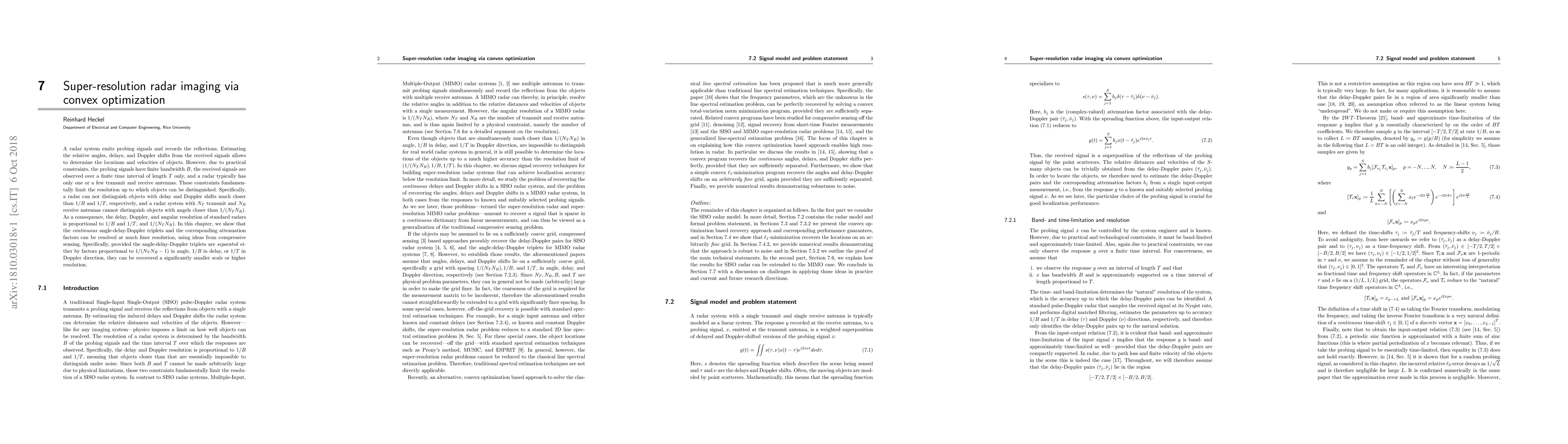 A radar system emits probing signals and records the reflections. Estimating the relative angles, delays, and Doppler shifts from the received signals allows to determine the locations and velocities of objects. However, due to practical constraints, the probing signals have finite bandwidth B, the received signals are observed over a finite time interval of length T only, and a radar typically has only one or a few transmit and receive antennas. These constraints fundamentally limit the resolution up to which objects can be distinguished. Specifically, a radar can not distinguish objects with delay and Doppler shifts much closer than 1/B and 1/T, respectively, and a radar system with N_T transmit and N_R receive antennas cannot distinguish objects with angels closer than 1/(N_T N_R). As a consequence, the delay, Doppler, and angular resolution of standard radars is proportional to 1/B and 1/T, and 1/(N_T N_R). In this chapter, we show that the continuous angle-delay-Doppler triplets and the corresponding attenuation factors can be resolved at much finer resolution, using ideas from compressive sensing. Specifically, provided the angle-delay-Doppler triplets are separated either by factors proportional to 1/(N_T N_R-1) in angle, 1/B in delay, or 1/T in Doppler direction, they can be recovered a significantly smaller scale or higher resolution.
