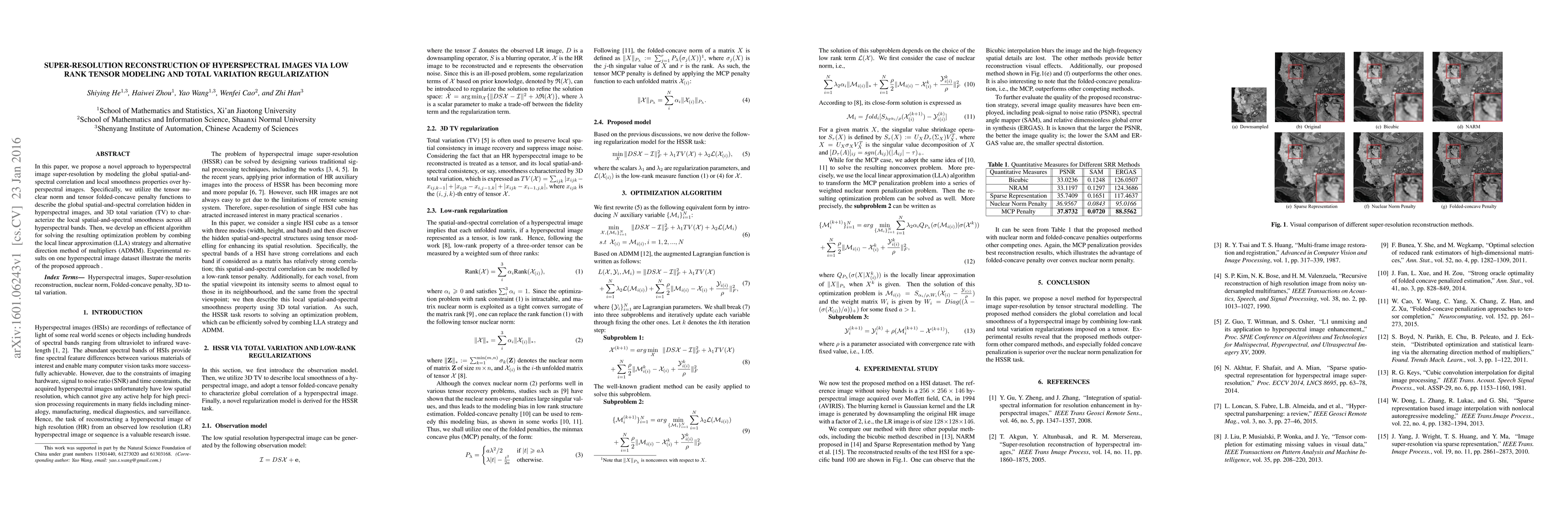 This paper introduces a new method for hyperspectral image super-resolution using low-rank tensor modeling and total variation regularization. The approach combines tensor nuclear norm and folded-concave penalty functions with 3D total variation to capture spatial-spectral correlations and local smoothness, and employs an efficient algorithm combining LLA and ADMM for optimization.