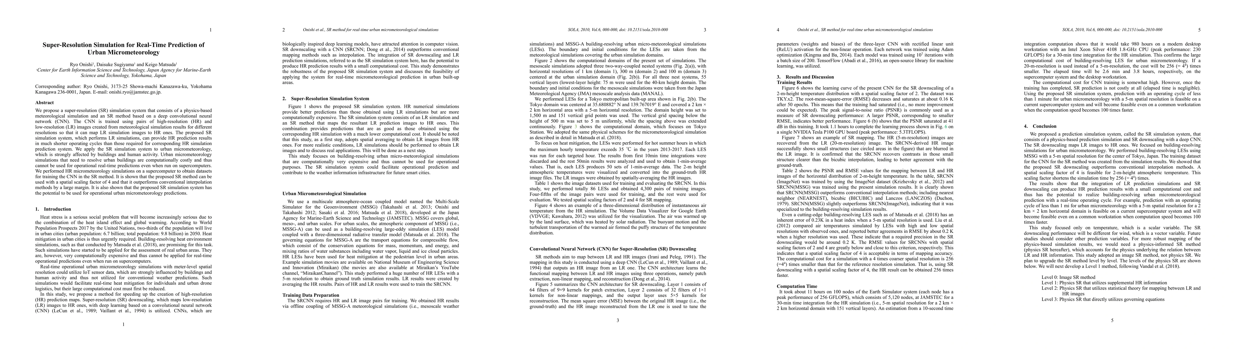 This paper proposes a super-resolution simulation system combining physics-based meteorological simulation and a deep CNN to enhance low-resolution simulations for urban micrometeorology. The system significantly reduces computational time for high-resolution predictions, outperforming conventional interpolation methods.