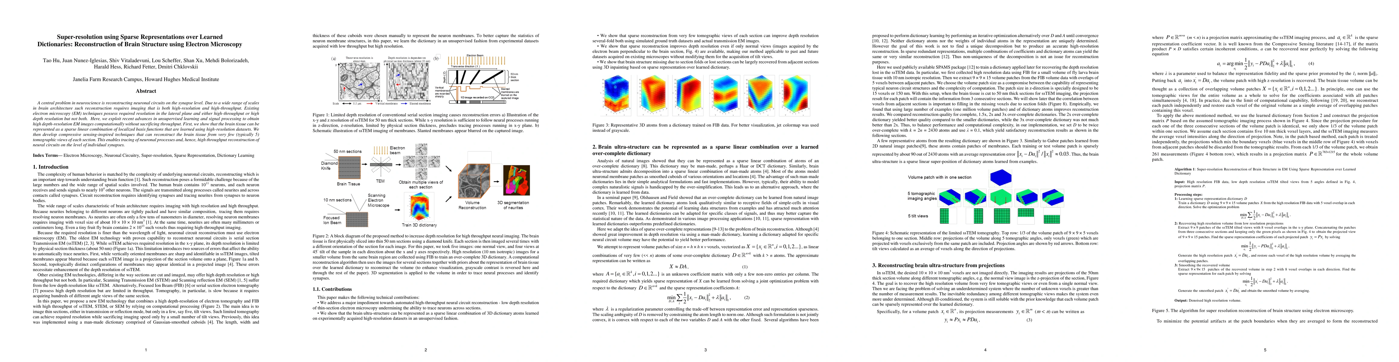 This paper proposes a method to reconstruct brain structures at synaptic levels using sparse representations over learned dictionaries and compressive sensing techniques. It leverages high-resolution electron microscopy data to computationally enhance depth resolution without sacrificing throughput, enabling high-throughput reconstruction of neuronal circuits.