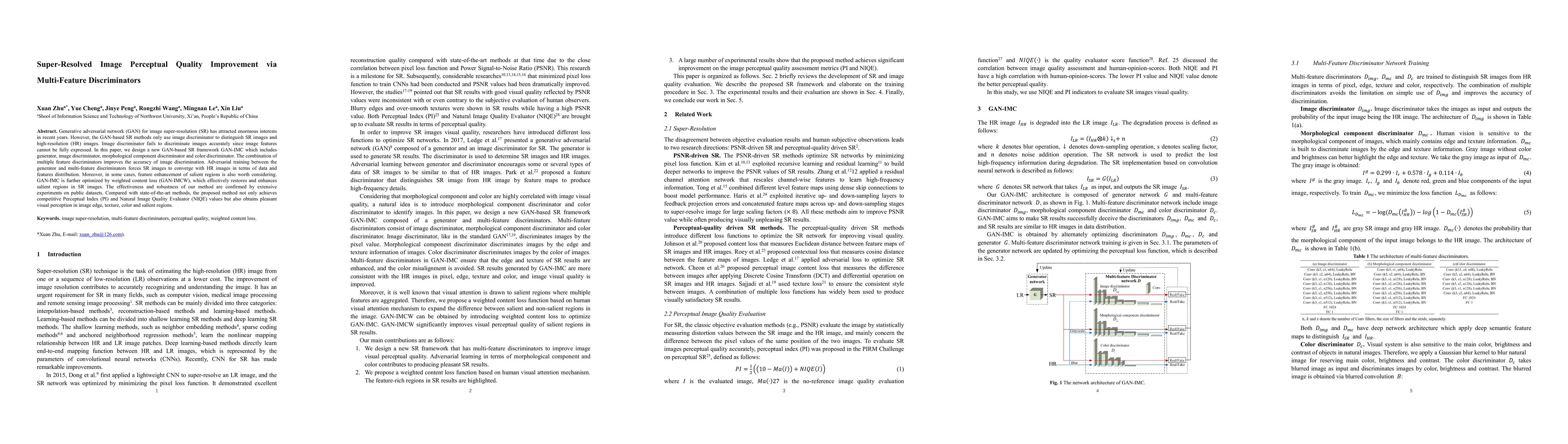 This paper proposes a GAN-based super-resolution framework called GAN-IMC that incorporates multiple feature discriminators to improve image perceptual quality. The method enhances salient regions using a weighted content loss, achieving competitive perceptual and visual quality metrics compared to state-of-the-art techniques.