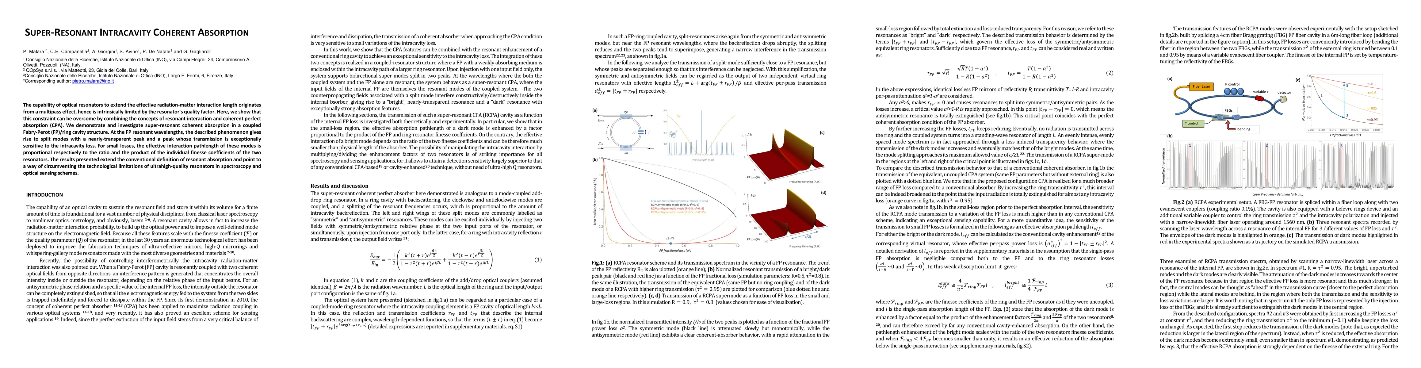 This paper demonstrates super-resonant coherent absorption in a coupled Fabry-Perot-ring cavity, overcoming the quality factor limitation of optical resonators. The phenomenon results in split modes with enhanced interaction pathlengths, offering a novel approach for spectroscopy and optical sensing.
