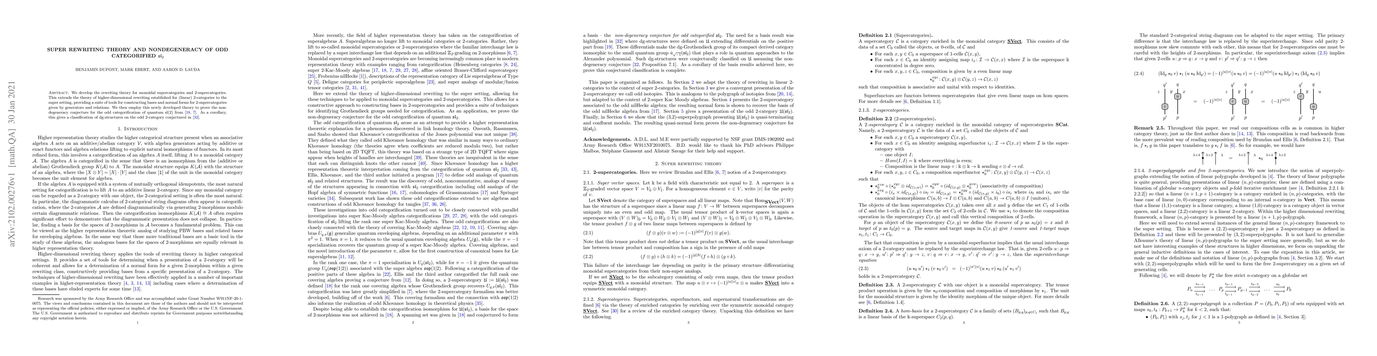 This paper develops a rewriting theory for monoidal supercategories and 2-supercategories, extending higher-dimensional rewriting to the super setting. The authors use this theory to prove the non-degeneracy of the odd categorification of quantum sl(2), leading to a classification of dg-structures on the odd 2-category.