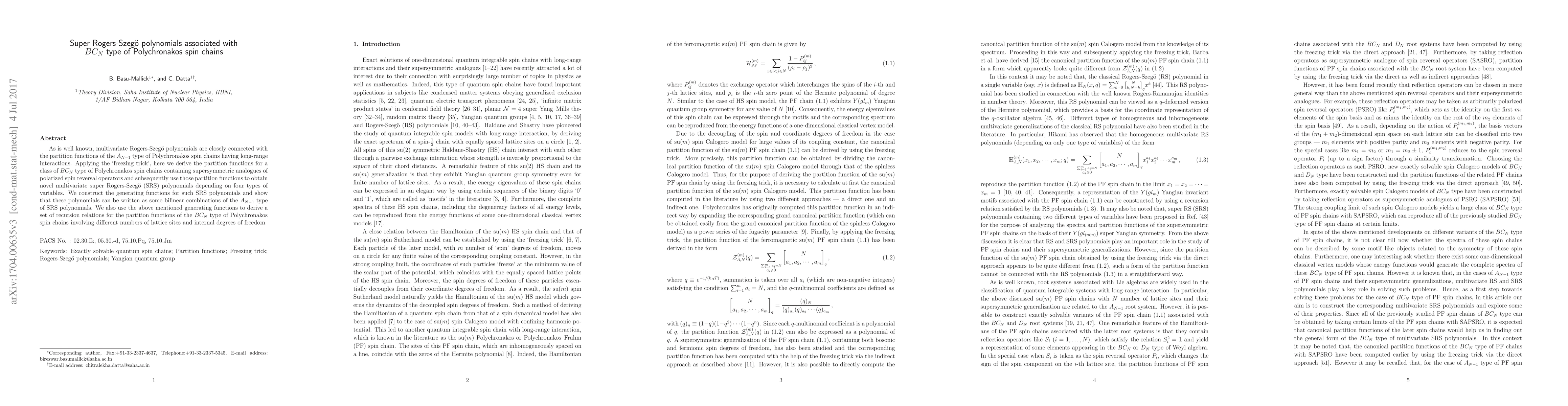 This paper introduces multivariate super Rogers-Szegő polynomials associated with $BC_N$ type Polychronakos spin chains, deriving their partition functions using the freezing trick. It constructs generating functions for these new SRS polynomials and establishes recursion relations for the partition functions of these spin chains.