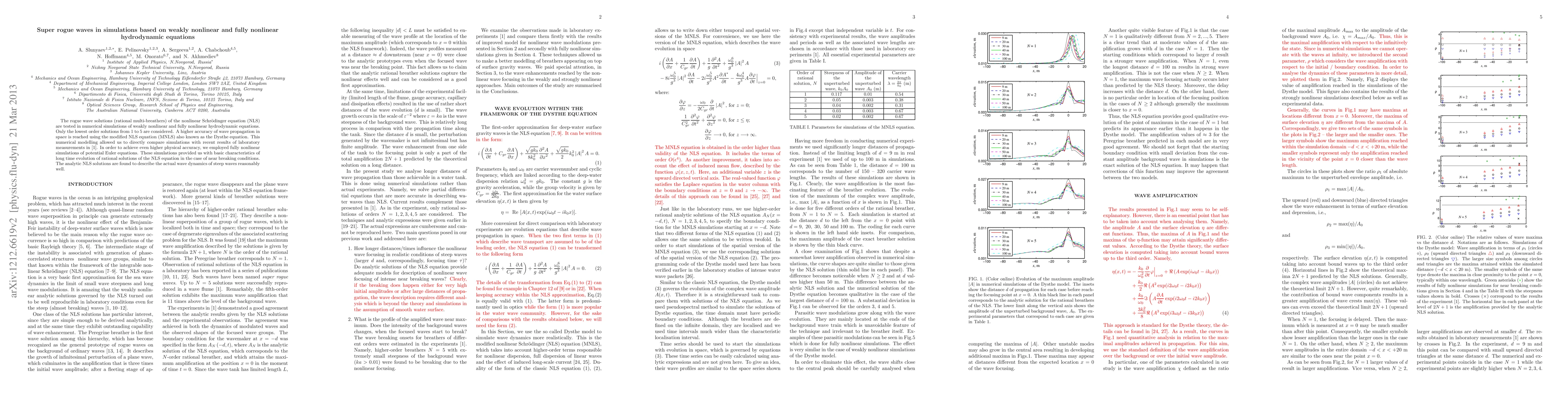 The rogue wave solutions (rational multi-breathers) of the nonlinear Schrodinger equation (NLS) are tested in numerical simulations of weakly nonlinear and fully nonlinear hydrodynamic equations. Only the lowest order solutions from 1 to 5 are considered. A higher accuracy of wave propagation in space is reached using the modified NLS equation (MNLS) also known as the Dysthe equation. This numerical modelling allowed us to directly compare simulations with recent results of laboratory measurements in \cite{Chabchoub2012c}. In order to achieve even higher physical accuracy, we employed fully nonlinear simulations of potential Euler equations. These simulations provided us with basic characteristics of long time evolution of rational solutions of the NLS equation in the case of near breaking conditions. The analytic NLS solutions are found to describe the actual wave dynamics of steep waves reasonably well.