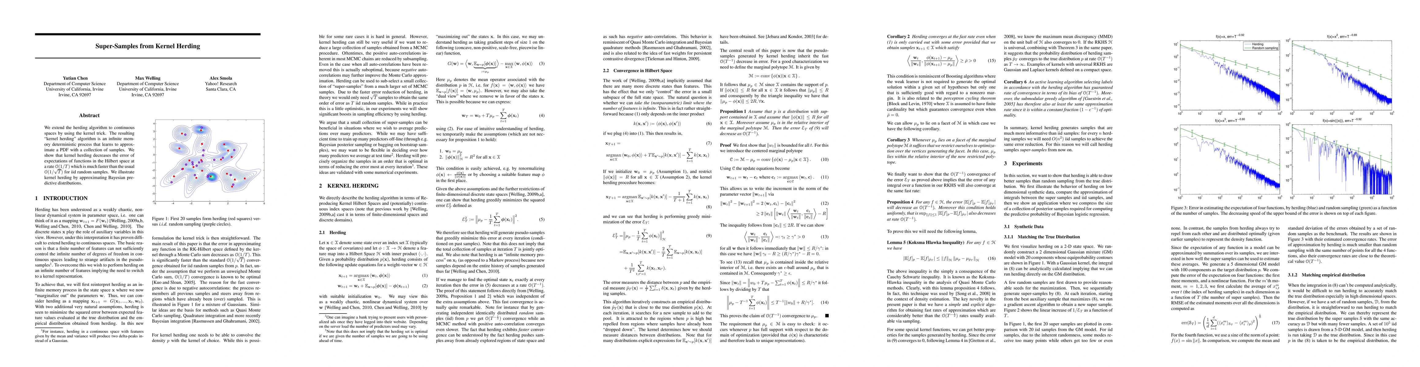 The paper proposes a kernel herding algorithm for continuous spaces, demonstrating faster convergence rates O(1/T) compared to O(1/pT) for iid random samples, and applies it to approximate Bayesian predictive distributions.