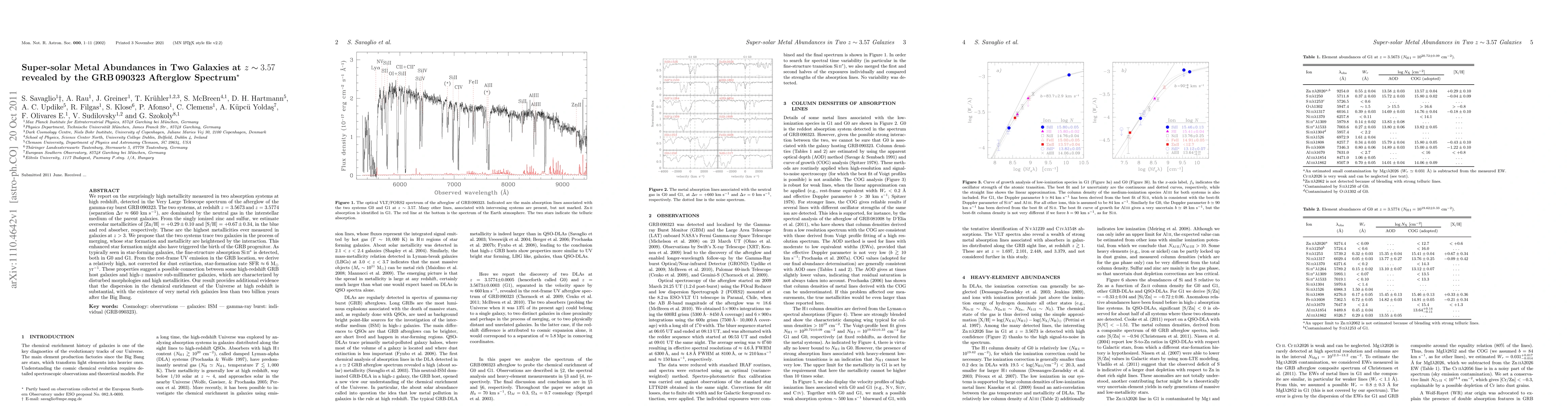 We report on the surprisingly high metallicity measured in two absorption systems at high redshift, detected in the Very Large Telescope spectrum of the afterglow of the gamma-ray burst GRB 090323. The two systems, at redshift z=3.5673 and z=3.5774 (separation Delta v ~ 660 km/s), are dominated by the neutral gas in the interstellar medium of the parent galaxies. From the singly ionized zinc and sulfur, we estimate oversolar metallicities of [Zn/H] =+0.29+/-0.10 and [S/H] = +0.67+/- 0.34, in the blue and red absorber, respectively. These are the highest metallicities ever measured in galaxies at z>3. We propose that the two systems trace two galaxies in the process of merging, whose star formation and metallicity are heightened by the interaction. This enhanced star formation might also have triggered the birth of the GRB progenitor. As typically seen in star-forming galaxies, the fine-structure absorption SiII* is detected, both in G0 and G1. From the rest-frame UV emission in the GRB location, we derive a relatively high, not corrected for dust extinction, star-formation rate SFR ~ 6 Msun/yr. These properties suggest a possible connection between some high-redshift GRB host galaxies and high-z massive sub-millimeter galaxies, which are characterized by disturbed morphologies and high metallicities. Our result provides additional evidence that the dispersion in the chemical enrichment of the Universe at high redshift is substantial, with the existence of very metal rich galaxies less than two billion years after the Big Bang.