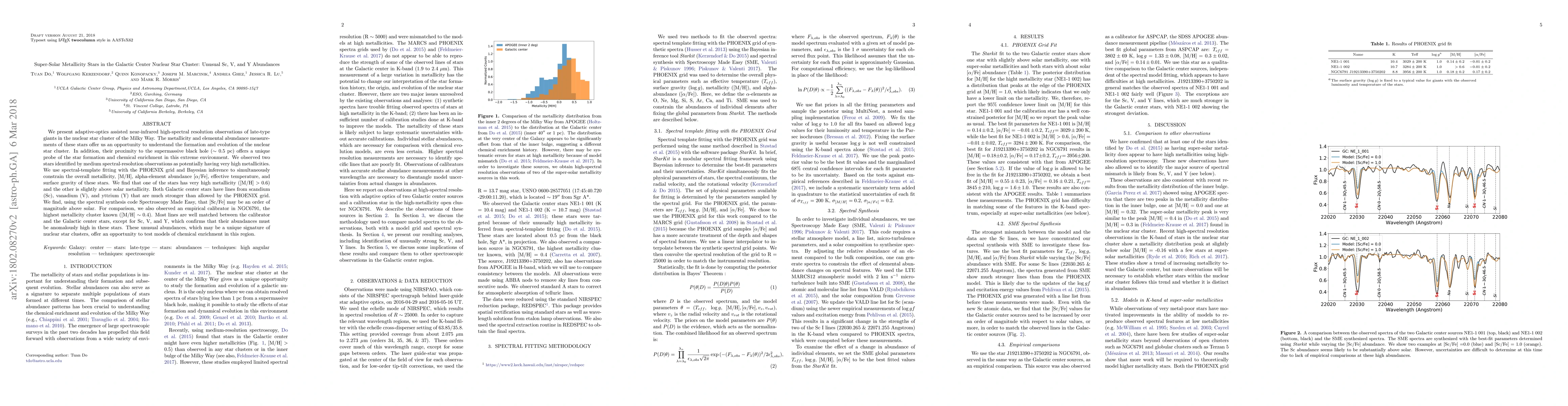 This study uses adaptive-optics assisted observations to analyze the metallicity and elemental abundances of late-type giants in the Milky Way's nuclear star cluster, revealing unusually high abundances of scandium, vanadium, and yttrium in two stars. These findings provide insights into the formation and chemical enrichment processes in the extreme environment near the supermassive black hole.