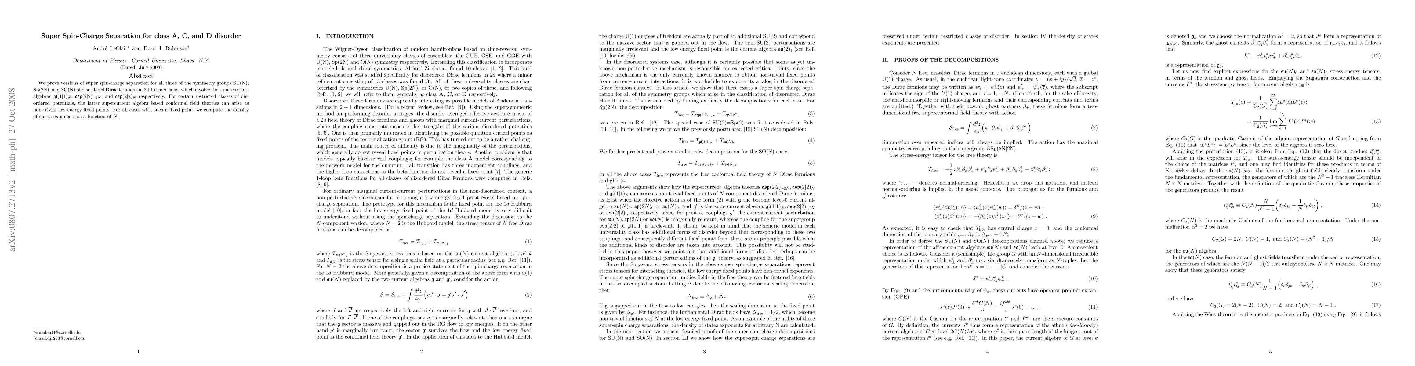 We prove versions of super spin-charge separation for all three of the symmetry groups SU(N), Sp(2N), and SO(N) of disordered Dirac fermions in 2+1 dimensions, which involve the supercurrent-algebras gl (1|1)_{N}, osp(2|2)_{-2N}, and osp(2|2)_N respectively. For certain restricted classes of disordered potentials, the latter supercurrent algebra based conformal field theories can arise as non-trivial low energy fixed points. For all cases with such a fixed point, we compute the density of states exponents as a function of N.