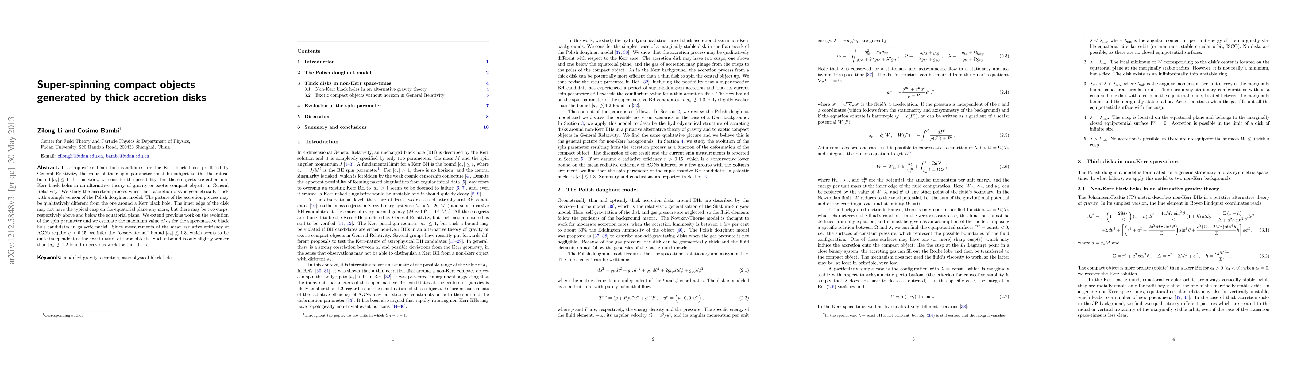 If astrophysical black hole candidates are the Kerr black holes predicted by General Relativity, the value of their spin parameter must be subject to the theoretical bound $|a_*| \le 1$. In this work, we consider the possibility that these objects are either non-Kerr black holes in an alternative theory of gravity or exotic compact objects in General Relativity. We study the accretion process when their accretion disk is geometrically thick with a simple version of the Polish doughnut model. The picture of the accretion process may be qualitatively different from the one around a Kerr black hole. The inner edge of the disk may not have the typical cusp on the equatorial plane any more, but there may be two cusps, respectively above and below the equatorial plane. We extend previous work on the evolution of the spin parameter and we estimate the maximum value of $a_*$ for the super-massive black hole candidates in galactic nuclei. Since measurements of the mean radiative efficiency of AGNs require $\eta > 0.15$, we infer the "observational" bound $|a_*| \lesssim 1.3$, which seems to be quite independent of the exact nature of these objects. Such a bound is only slightly weaker than $|a_*| \lesssim 1.2$ found in previous work for thin disks.