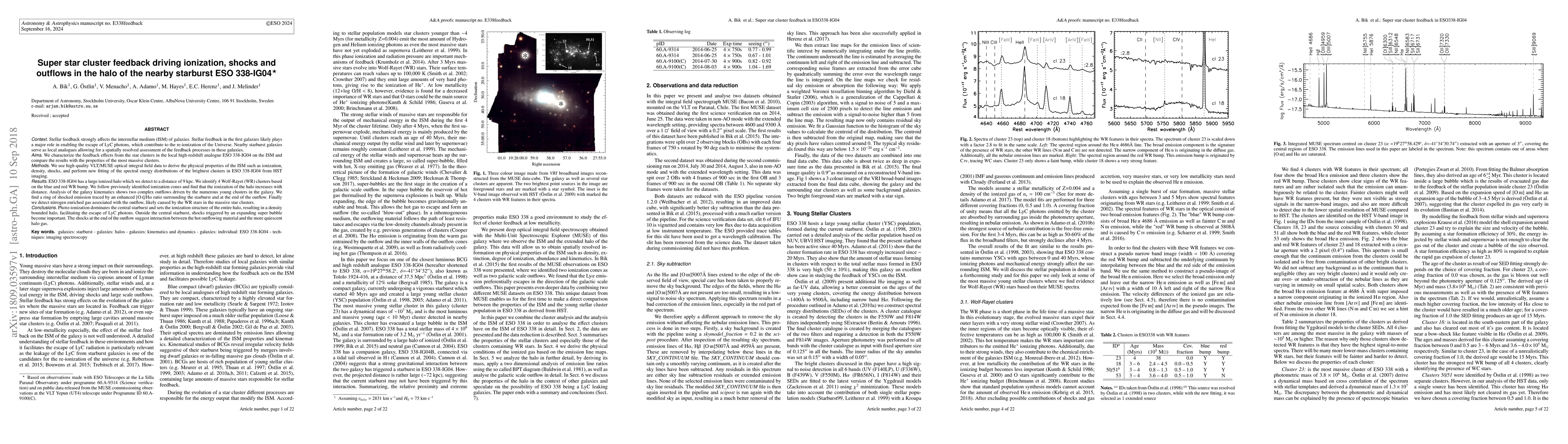 This paper investigates the feedback mechanisms from star clusters in the starburst galaxy ESO 338-IG04, revealing a large ionized halo and complex outflows driven by young clusters. The study finds that photo-ionization from the central starburst dominates the ionization structure, while shocks from expanding super bubbles affect the outer halo, suggesting significant roles in the re-ionization of the Universe.