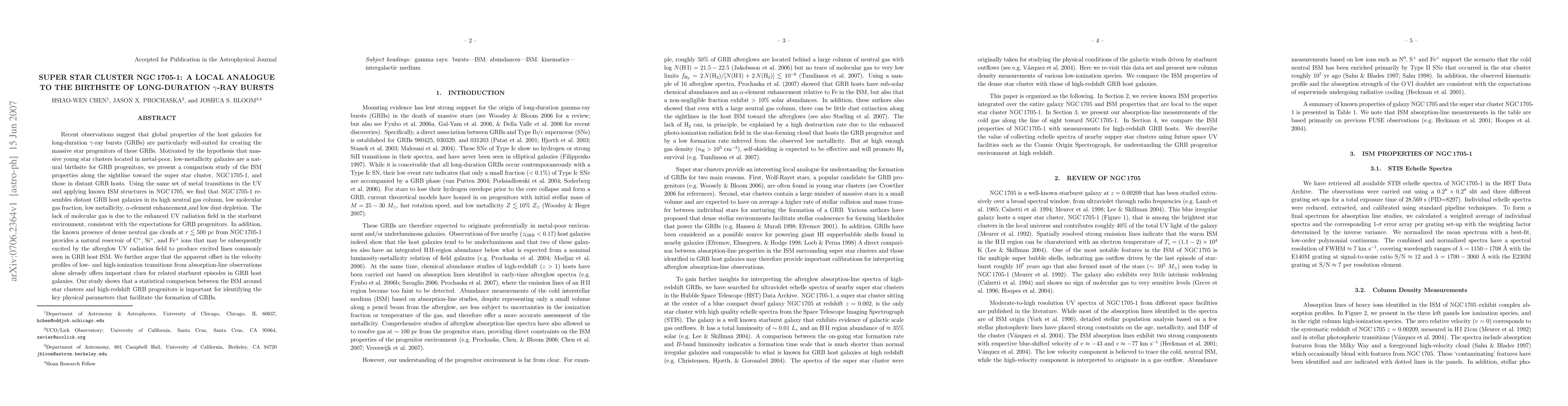 Recent observations suggest that global properties of the host galaxies for long-duration gamma-ray bursts (GRBs) are particularly well-suited for creating the massive star progenitors of these GRBs. Motivated by the hypothesis that massive young star clusters located in metal-poor, low-metallicity galaxies are a natural birthsite for GRB progenitors, we present a comparison study of the ISM properties along the sightline toward the super star cluster, NGC1705-1, and those in distant GRB hosts. Using the same set of metal transitions in the UV and applying known ISM structures in NGC1705, we find that NGC1705-1 resembles distant GRB host galaxies in its high neutral gas column, low molecular gas fraction, low metallicity, alpha-element enhancement,and low dust depletion. The lack of molecular gas is due to the enhanced UV radiation field in the starburst environment, consistent with the expectations for GRB progenitors. In addition, the known presence of dense neutral gas clouds at r<500 pc from NGC1705-1 provides a natural reservoir of C^+, Si^+, and Fe^+ ions that may be subsequently excited by the afterglow UV radiation field to produce excited lines commonly seen in GRB host ISM. We further argue that the apparent offset in the velocity profiles of low- and high-ionization transitions from absorption-line observations alone already offers important clues for related starburst episodes in GRB host galaxies. Our study shows that a statistical comparison between the ISM around star clusters and high-redshift GRB progenitors is important for identifying the key physical parameters that facilitate the formation of GRBs.