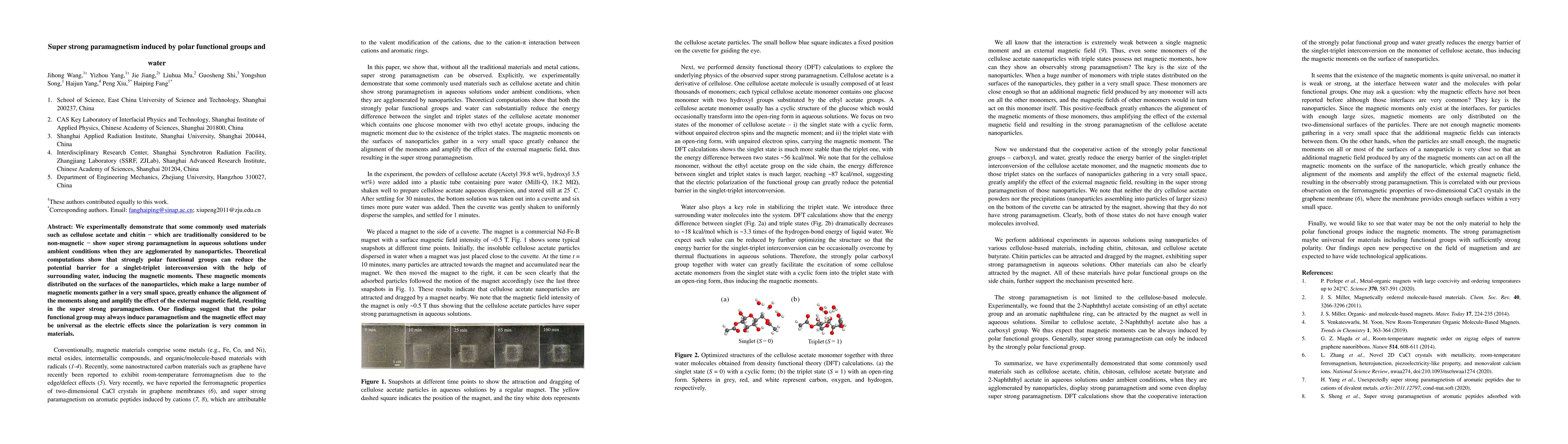 This research demonstrates that cellulose acetate and chitin, typically non-magnetic, exhibit super strong paramagnetism in aqueous solutions when combined with nanoparticles. The presence of polar functional groups and water facilitates singlet-triplet interconversion, amplifying the magnetic moments and resulting in enhanced paramagnetism.