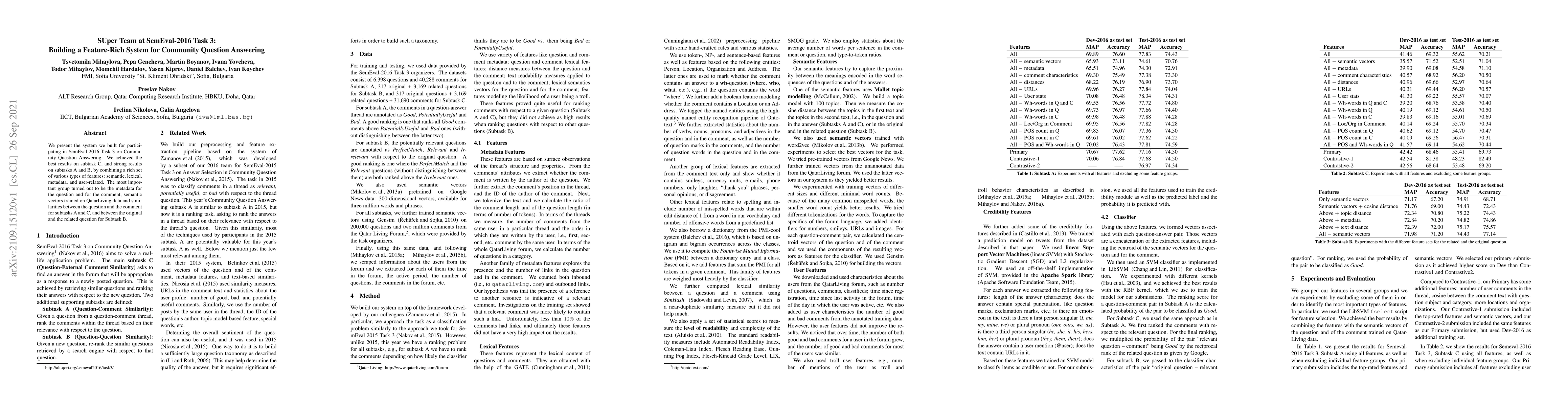 Title: SUper Team at SemEval-2016 Task 3: Building a feature-rich system for community question answering Summary: The SUper Team developed a feature-rich system for SemEval-2016 Task 3, achieving top results in subtask C and strong performances in subtasks A and B by leveraging diverse features including semantic, lexical, metadata, and user-related data. Metadata and semantic similarities were particularly crucial for their success.