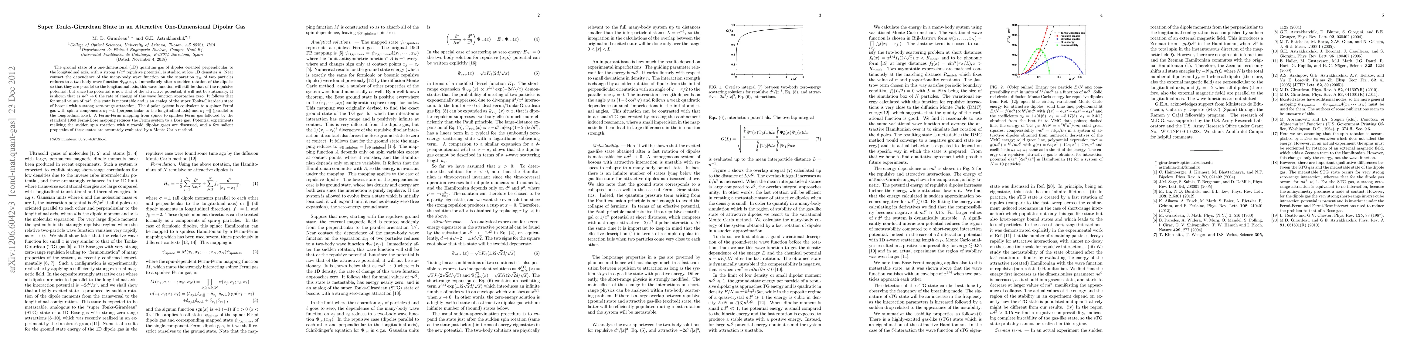 The ground state of a one-dimensional (1D) quantum gas of dipoles oriented perpendicular to the longitudinal axis, with a strong 1/x^3 repulsive potential, is studied at low 1D densities $n$. Near contact the dependence of the many-body wave function on the separation x_{jl} of two particles reduces to a two-body wave function \Psi_{rel}(x_{jl}). Immediately after a sudden rotation of the dipoles so that they are parallel to the longitudinal axis, this wave function will still be that of the repulsive potential, but since the potential is now that of the attractive potential, it will not be stationary. It is shown that as nd^2 -> 0 the rate of change of this wave function approaches zero. It follows that for small values of nd^2, this state is metastable and is an analog of the super Tonks-Girardeau state of bosons with a strong zero-range attraction. The dipolar system is equivalent to a spinor Fermi gas with spin $z$ components \sigma_{\uparrow}=\perp (perpendicular to the longitudinal axis) and \sigma_{\downarrow}=|| (parallel to the longitudinal axis). A Fermi-Fermi mapping from spinor to spinless Fermi gas followed by the standard 1960 Fermi-Bose mapping reduces the Fermi system to a Bose gas. Potential experiments realizing the sudden spin rotation with ultracold dipolar gases are discussed, and a few salient properties of these states are accurately evaluated by a Monte Carlo method.
