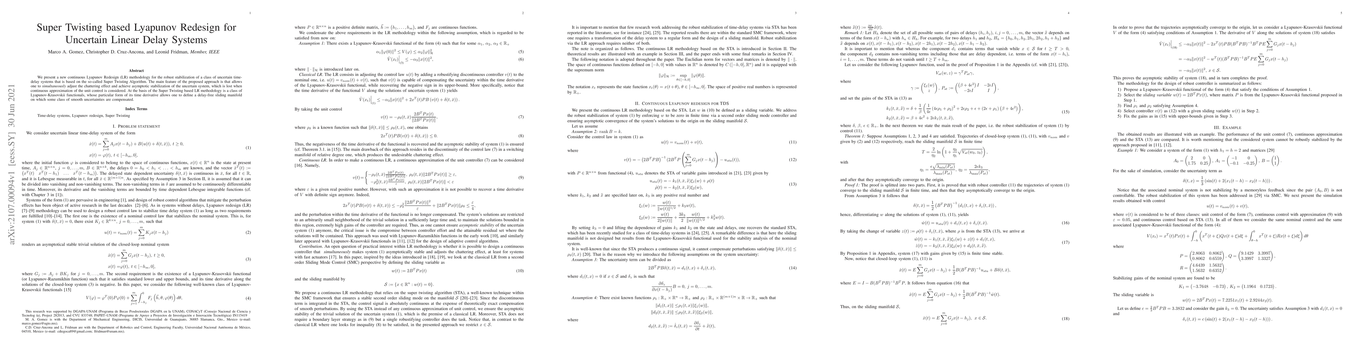 This paper introduces a new continuous Lyapunov Redesign methodology based on the Super Twisting Algorithm for robust stabilization of uncertain time-delay systems. The approach effectively mitigates chattering while achieving asymptotic stabilization, addressing issues with continuous approximations of unit control.