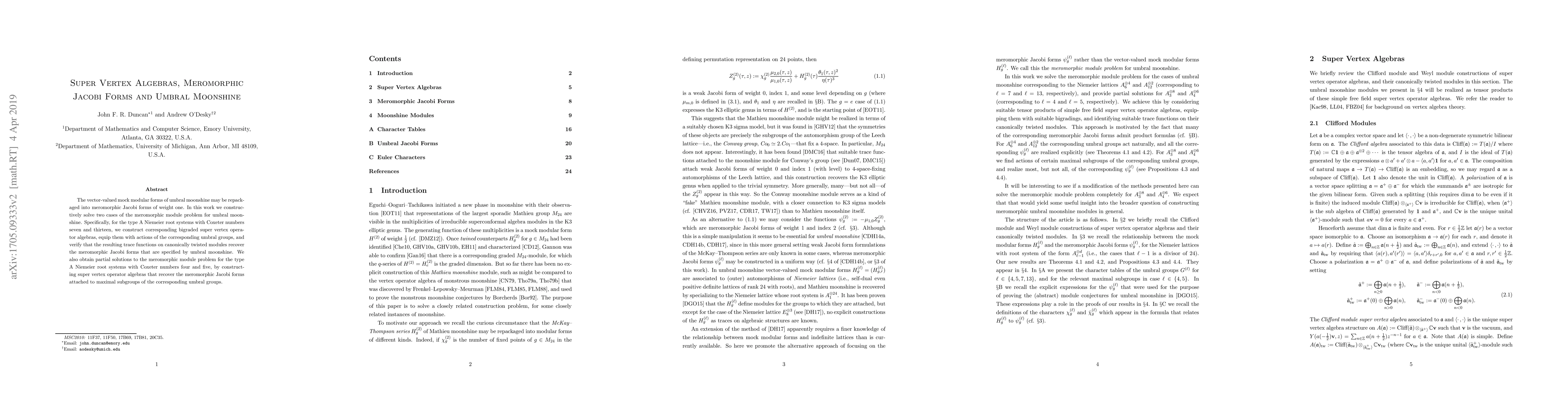 The vector-valued mock modular forms of umbral moonshine may be repackaged into meromorphic Jacobi forms of weight one. In this work we constructively solve two cases of the meromorphic module problem for umbral moonshine. Specifically, for the type A Niemeier root systems with Coxeter numbers seven and thirteen, we construct corresponding bigraded super vertex operator algebras, equip them with actions of the corresponding umbral groups, and verify that the resulting trace functions on canonically twisted modules recover the meromorphic Jacobi forms that are specified by umbral moonshine. We also obtain partial solutions to the meromorphic module problem for the type A Niemeier root systems with Coxeter numbers four and five, by constructing super vertex operator algebras that recover the meromorphic Jacobi forms attached to maximal subgroups of the corresponding umbral groups.