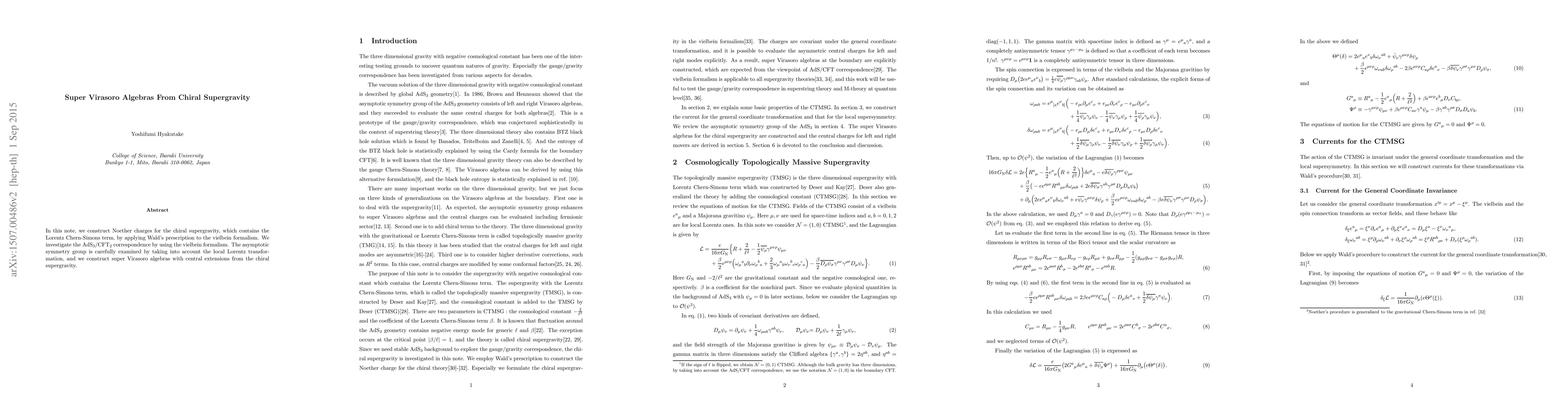 This paper constructs Noether charges for chiral supergravity using Wald's prescription in the vielbein formalism, and investigates the AdS3/CFT2 correspondence. It identifies the asymptotic symmetry group, including local Lorentz transformations, to construct super Virasoro algebras with central extensions.