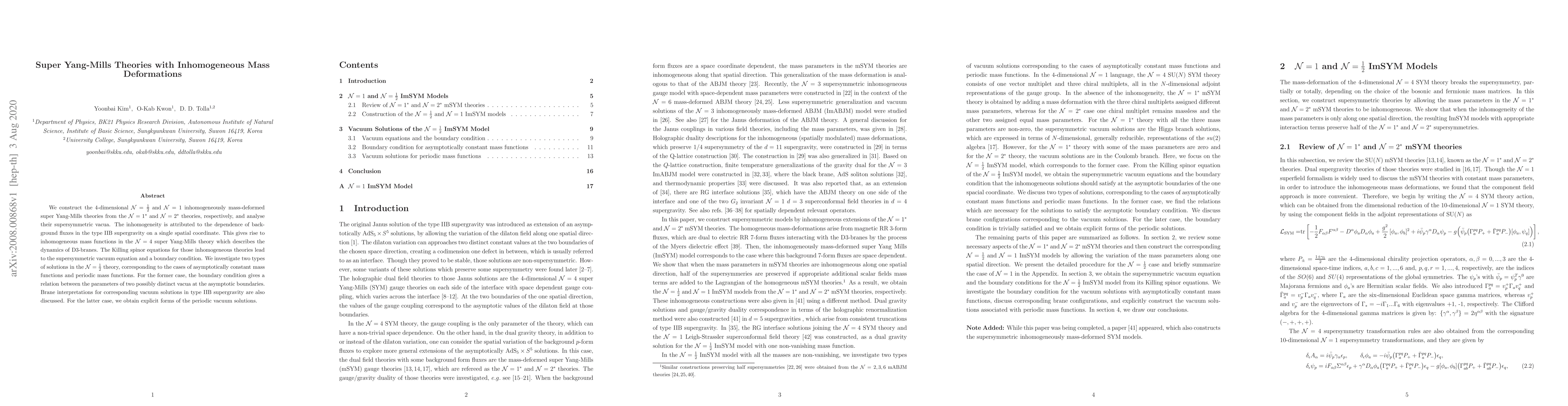 We construct the 4-dimensional ${\cal N}=\frac12$ and ${\cal N}=1$ inhomogeneously mass-deformed super Yang-Mills theories from the ${\cal N} =1^*$ and ${\cal N} =2^*$ theories, respectively, and analyse their supersymmetric vacua. The inhomogeneity is attributed to the dependence of background fluxes in the type IIB supergravity on a single spatial coordinate. This gives rise to inhomogeneous mass functions in the ${\cal N} =4$ super Yang-Mills theory which describes the dynamics of D3-branes. The Killing spinor equations for those inhomogeneous theories lead to the supersymmetric vacuum equation and a boundary condition. We investigate two types of solutions in the $ {\cal N}=\frac12$ theory, corresponding to the cases of asymptotically constant mass functions and periodic mass functions. For the former case, the boundary condition gives a relation between the parameters of two possibly distinct vacua at the asymptotic boundaries. Brane interpretations for corresponding vacuum solutions in type IIB supergravity are also discussed. For the latter case, we obtain explicit forms of the periodic vacuum solutions.