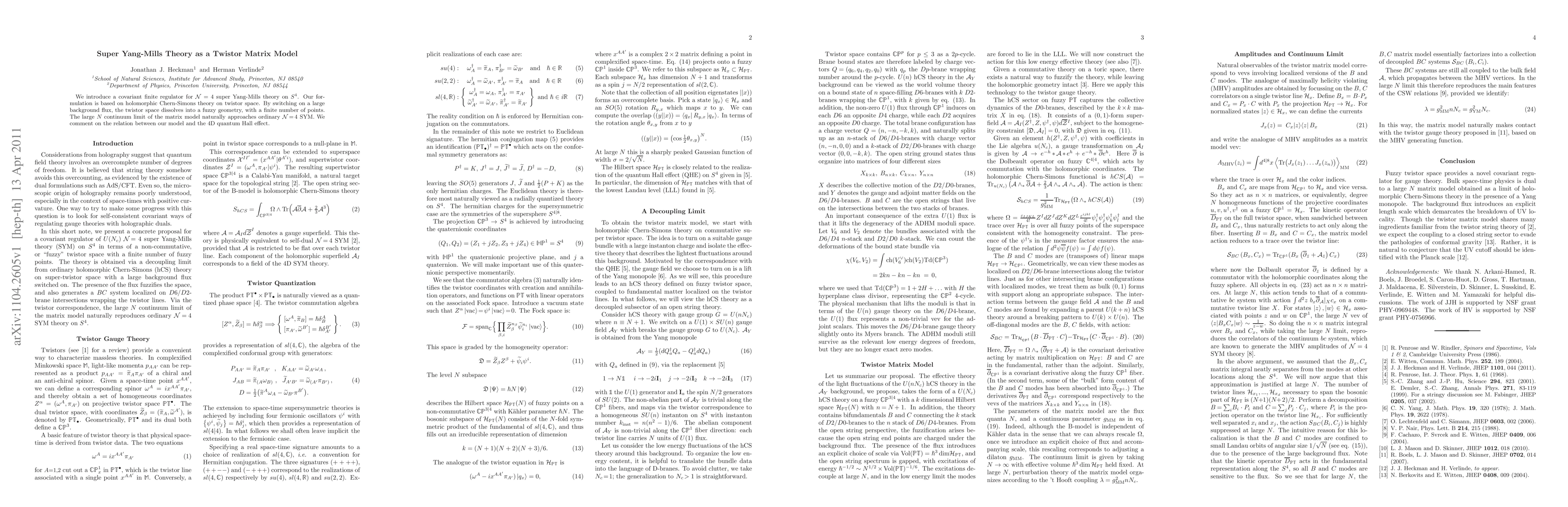 We introduce a covariant finite regulator for N = 4 super Yang-Mills theory on S^4. Our formulation is based on holomorphic Chern-Simons theory on twistor space. By switching on a large background flux, the twistor space dissolves into a fuzzy geometry, with a finite number of points. The large N continuum limit of the matrix model naturally approaches ordinary N = 4 SYM. We comment on the relation between our model and the 4D quantum Hall effect.