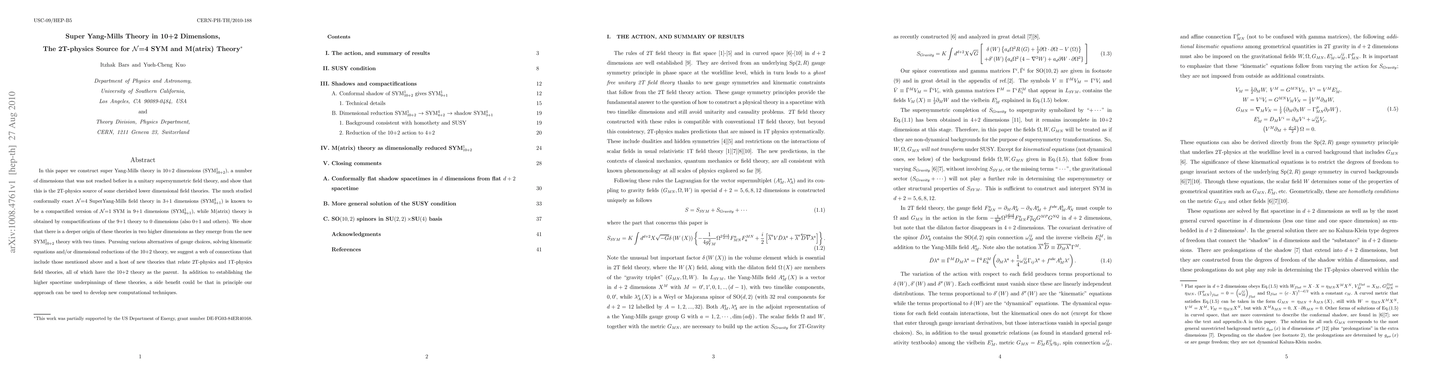 In this paper we construct super Yang-Mills theory in 10+2 dimensions, a number of dimensions that was not reached before in a unitary supersymmetric field theory, and show that this is the 2T-physics source of some cherished lower dimensional field theories. The much studied conformally exact N=4 Super Yang-Mills field theory in 3+1 dimensions is known to be a compactified version of N=1 SYM in 9+1 dimensions, while M(atrix) theory is obtained by compactifications of the 9+1 theory to 0 dimensions (also 0+1 and others). We show that there is a deeper origin of these theories in two higher dimensions as they emerge from the new theory with two times. Pursuing various alternatives of gauge choices, solving kinematic equations and/or dimensional reductions of the 10+2 theory, we suggest a web of connections that include those mentioned above and a host of new theories that relate 2T-physics and 1T-physics field theories, all of which have the 10+2 theory as the parent. In addition to establishing the higher spacetime underpinnings of these theories, a side benefit could be that in principle our approach can be used to develop new computational techniques.