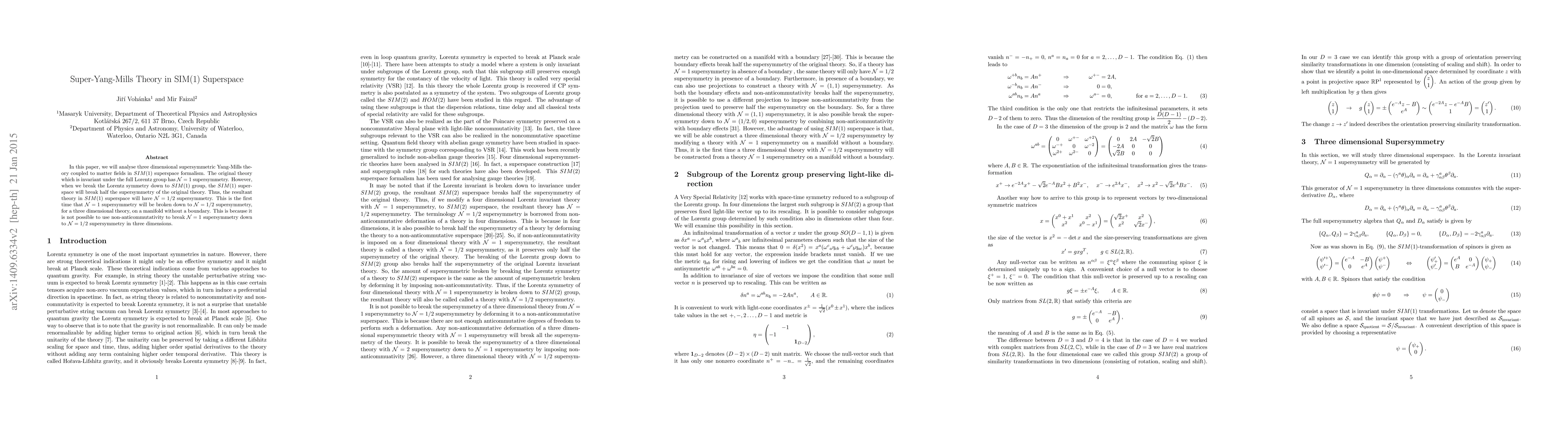 This paper analyzes a three-dimensional supersymmetric Yang-Mills theory coupled to matter fields, transitioning from full Lorentz invariance to invariance under the SIM(1) group. The original $\mathcal{N} =1$ supersymmetry is reduced to $\mathcal{N} =1/2$ upon breaking Lorentz symmetry, marking the first such transition in a three-dimensional theory on a boundaryless manifold.