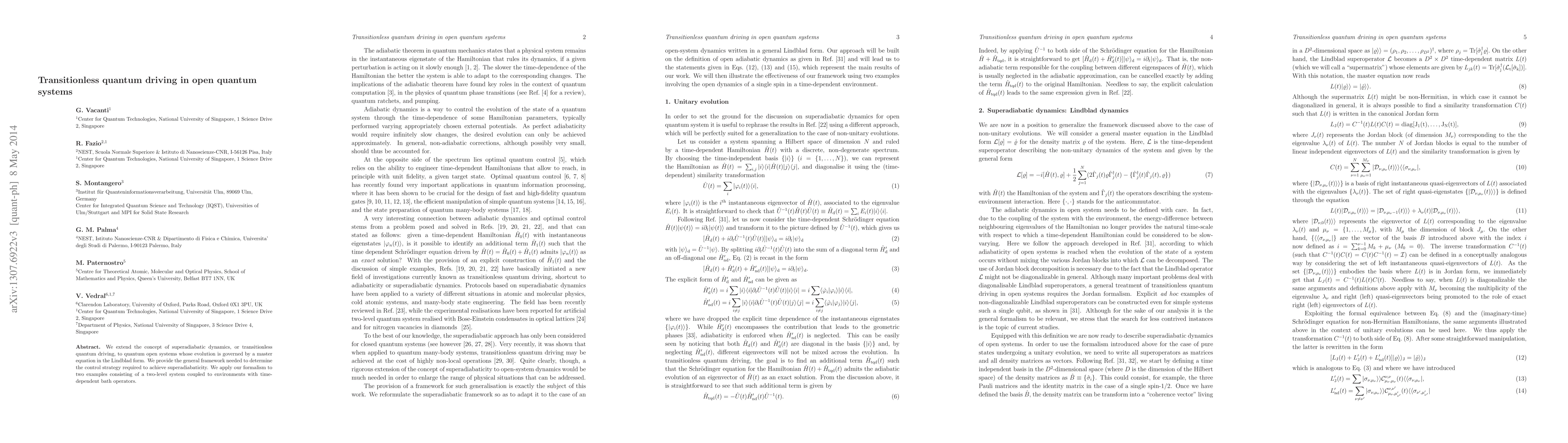We extend the concept of superadiabatic dynamics, or transitionless quantum driving, to quantum open systems whose evolution is governed by a master equation in the Lindblad form. We provide the general framework needed to determine the control strategy required to achieve superadiabaticity. We apply our formalism to two examples consisting of a two-level system coupled to environments with time-dependent bath operators.