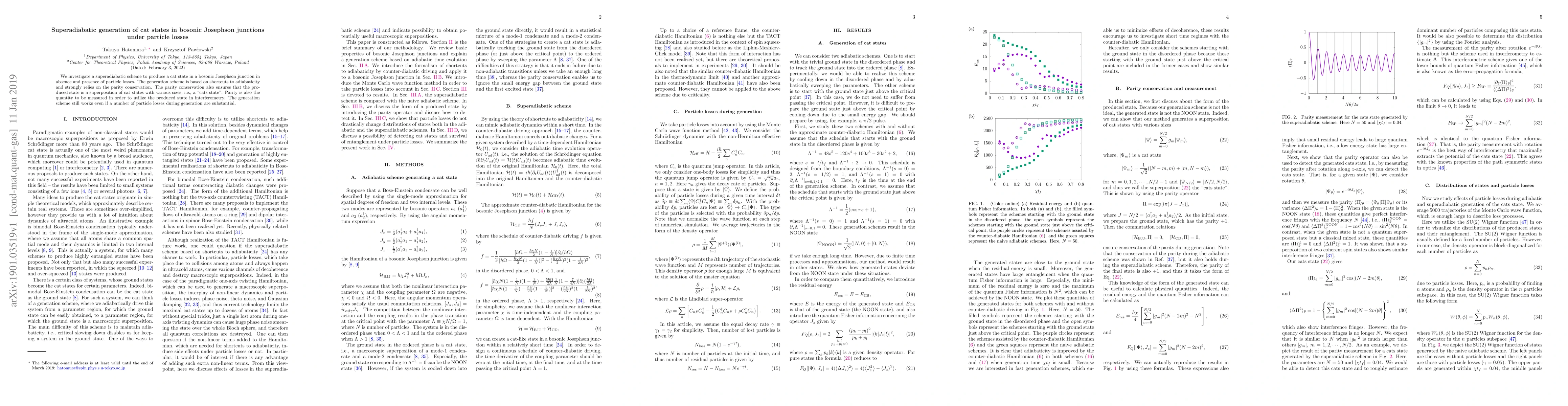 This paper explores a superadiabatic method for generating cat states in bosonic Josephson junctions, emphasizing the role of parity conservation and its robustness against particle losses. The scheme produces a superposition of cat states, which can be utilized in interferometry.