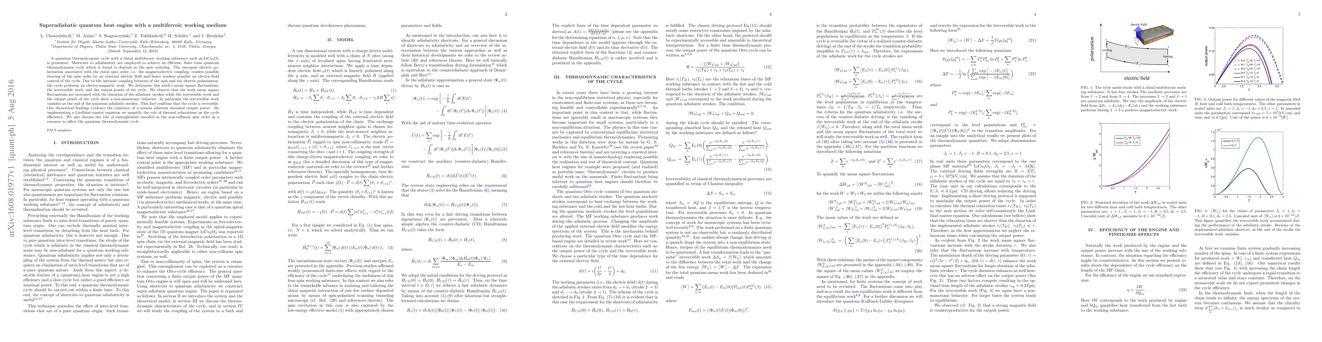 The paper presents a detailed theoretical analysis of a quantum Otto cycle using a chiral multiferroic working medium, implementing shortcuts to adiabaticity, and evaluating the cycle's performance in terms of work fluctuations, reversible work, and output power.
