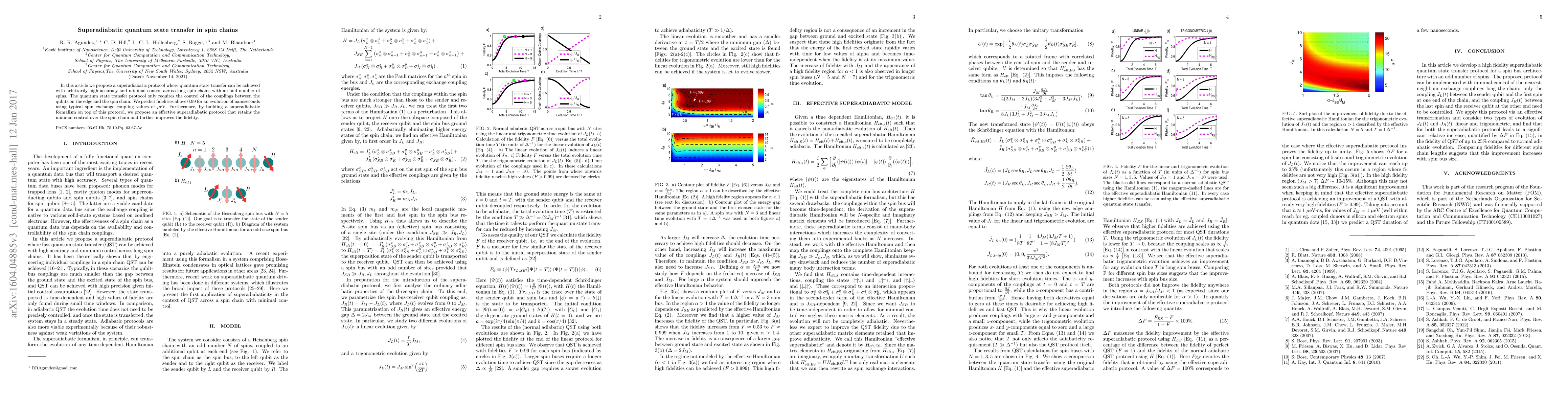 This paper proposes a superadiabatic protocol for high-fidelity quantum state transfer across spin chains with minimal control, achieving fidelities above 0.99 in nanoseconds. An enhanced superadiabatic formalism further improves fidelity by up to 20% while maintaining minimal control over the spin chain.