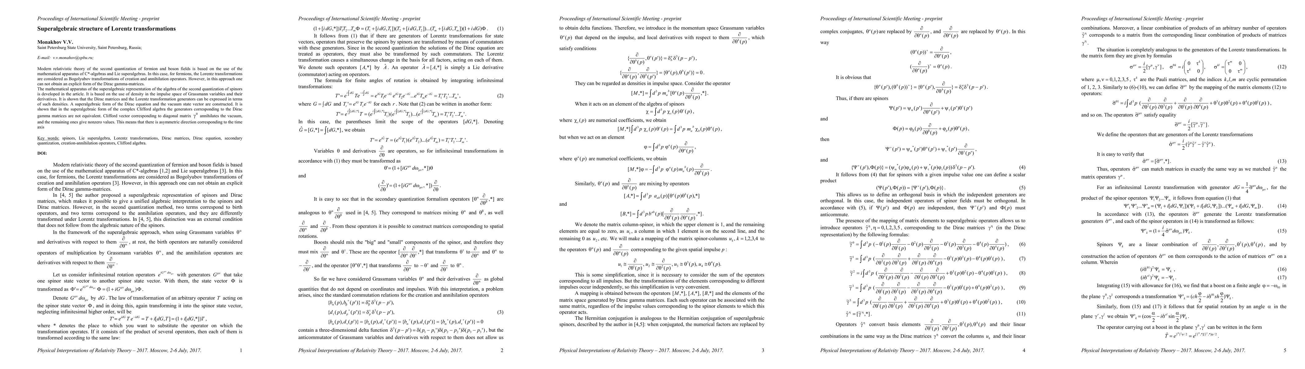 This paper develops a superalgebraic representation for the Lorentz transformations in the context of second quantization of fermion and boson fields, showing how Dirac gamma-matrices and Lorentz transformation generators can be expressed using densities of Grassmann variables. It reveals an asymmetric direction in the complex Clifford algebra corresponding to the time axis.