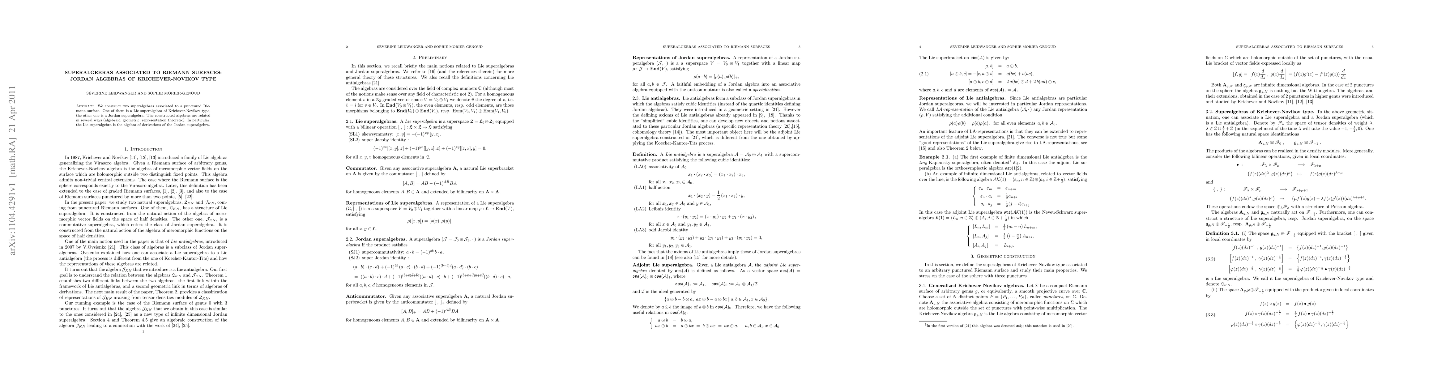 This paper constructs two superalgebras linked to a punctured Riemann surface: a Lie superalgebra of Krichever-Novikov type and a Jordan superalgebra. These algebras exhibit deep algebraic, geometric, and representation-theoretic connections, with the Lie superalgebra identified as the derivations of the Jordan superalgebra.